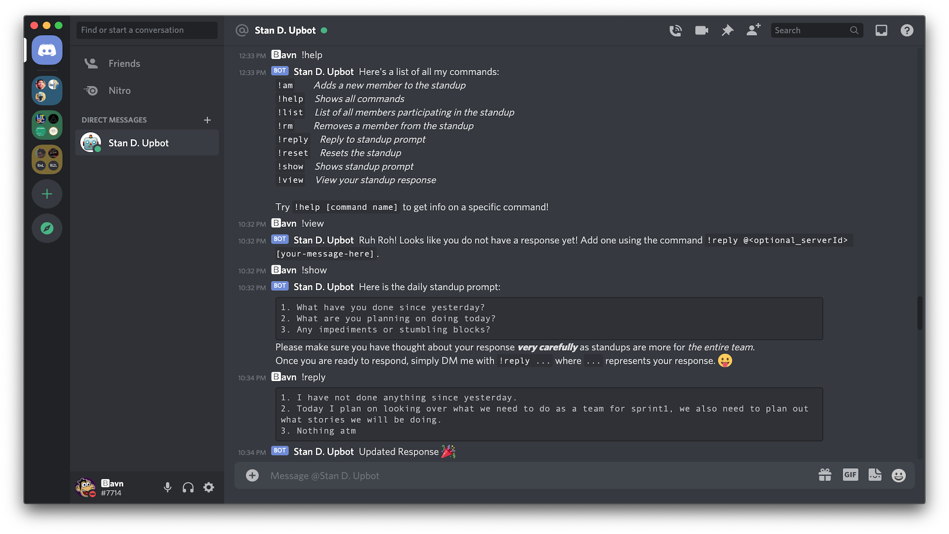 메시지가 게시되면 봇은 모든 멤버 응답을 삭제하므로 회원은 다음 스탠드 업을 위해 DM을해야합니다.