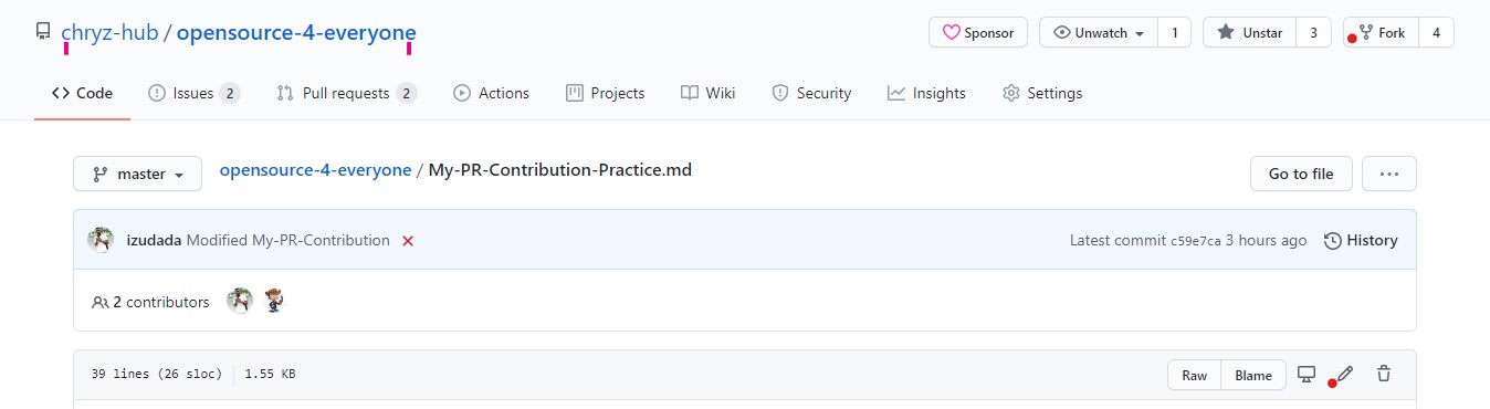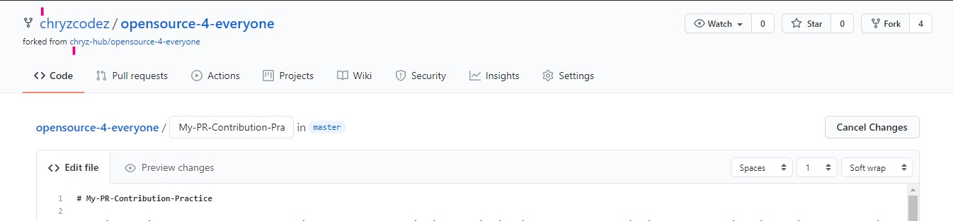이것은 해당/ 메인 리포지토리의 개인 버전을 갖도록 저장소를 복제합니다. 따라서 이것은 먼저 기여하고자하는 저장소를 포크 한 다음 개인 Github 리포지토리에서 확인하기 위해 이동하는 것이 좋습니다. 그곳에서 포크 리포지토리를 찾을 수 있습니다. 편집 (Pencil) 버튼을 클릭 할 수도 있으며, 이는 REPO를 버전으로 자동으로 포크 할 수 있습니다. 포크 또는 편집하기 전에 올바른 저장소에 있는지 확인하십시오. 샘플로 사용 된 저장소의 이름을 볼 수 있습니다!