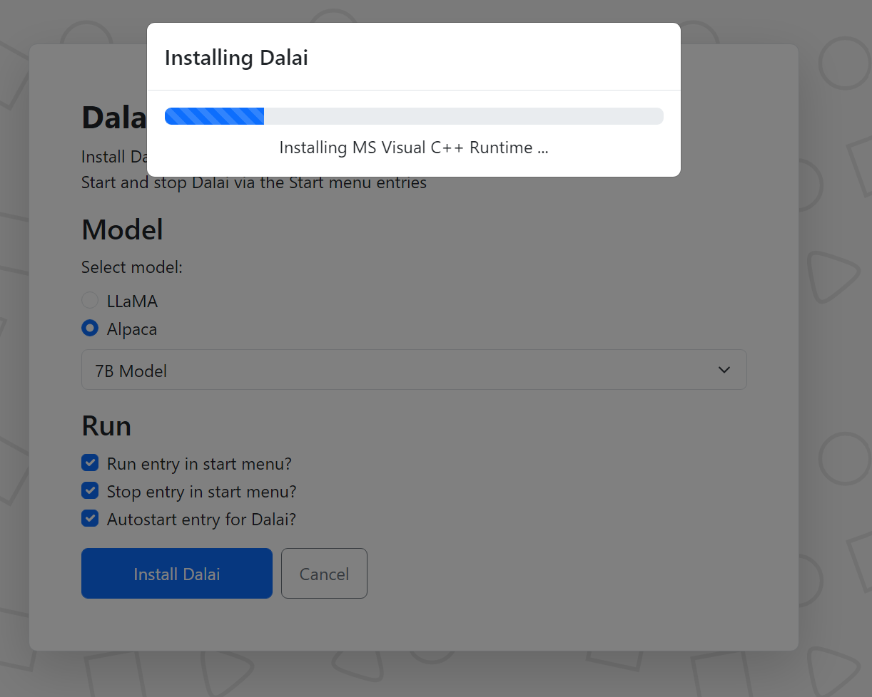 그런 다음 Dalai (https://github.com/cocktailpeanut/dalai)에 필요한 모든 종속성을 설치하는 명령을 실행합니다.