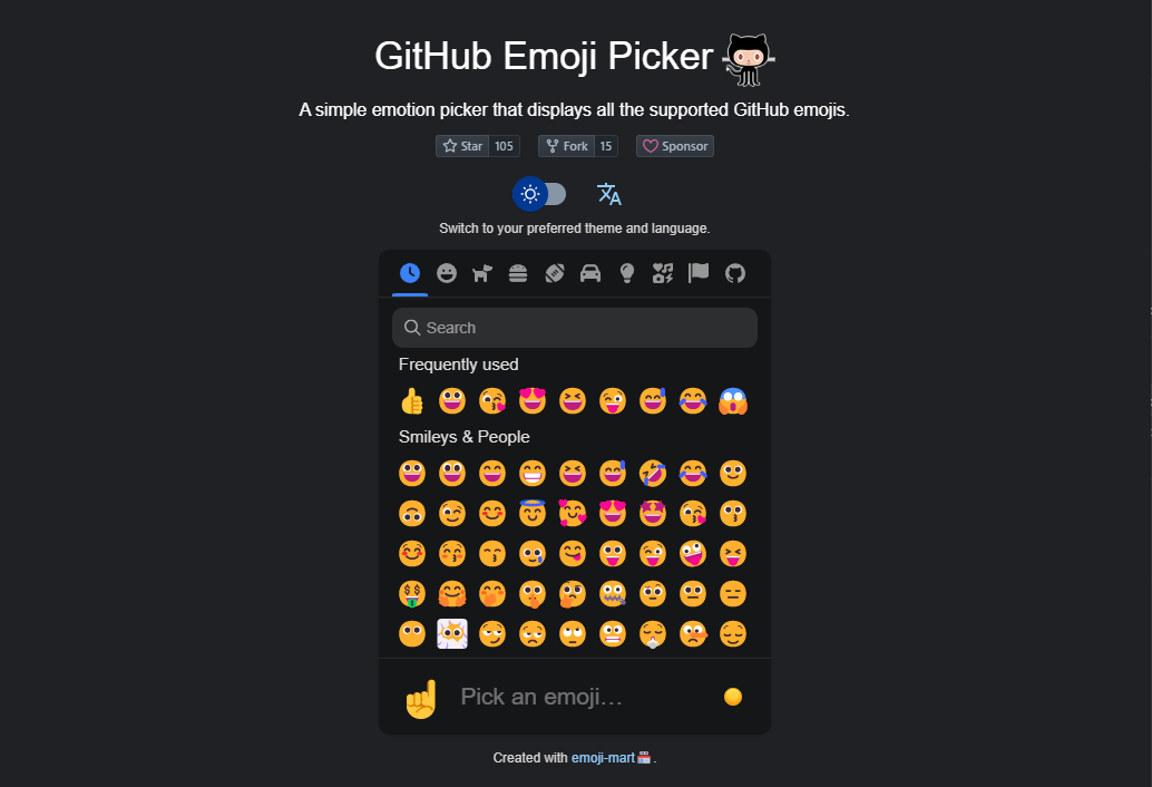 Github가 지원하는 모든 이모티콘을 표시하는 간단한 이모티콘 피커. Github Emoji API 및 Unicode Full Emoji 목록에서 자동으로 생성됩니다.