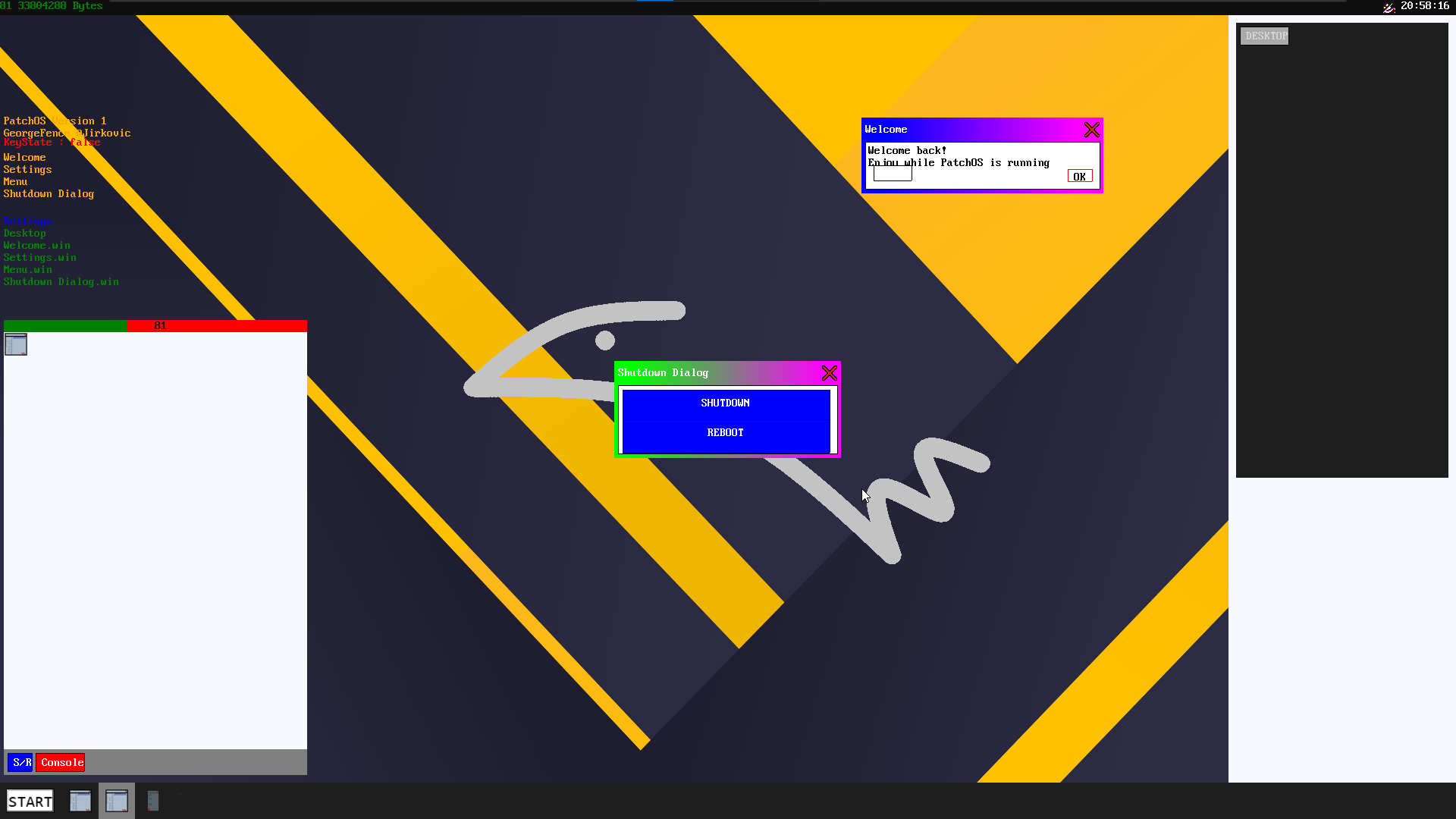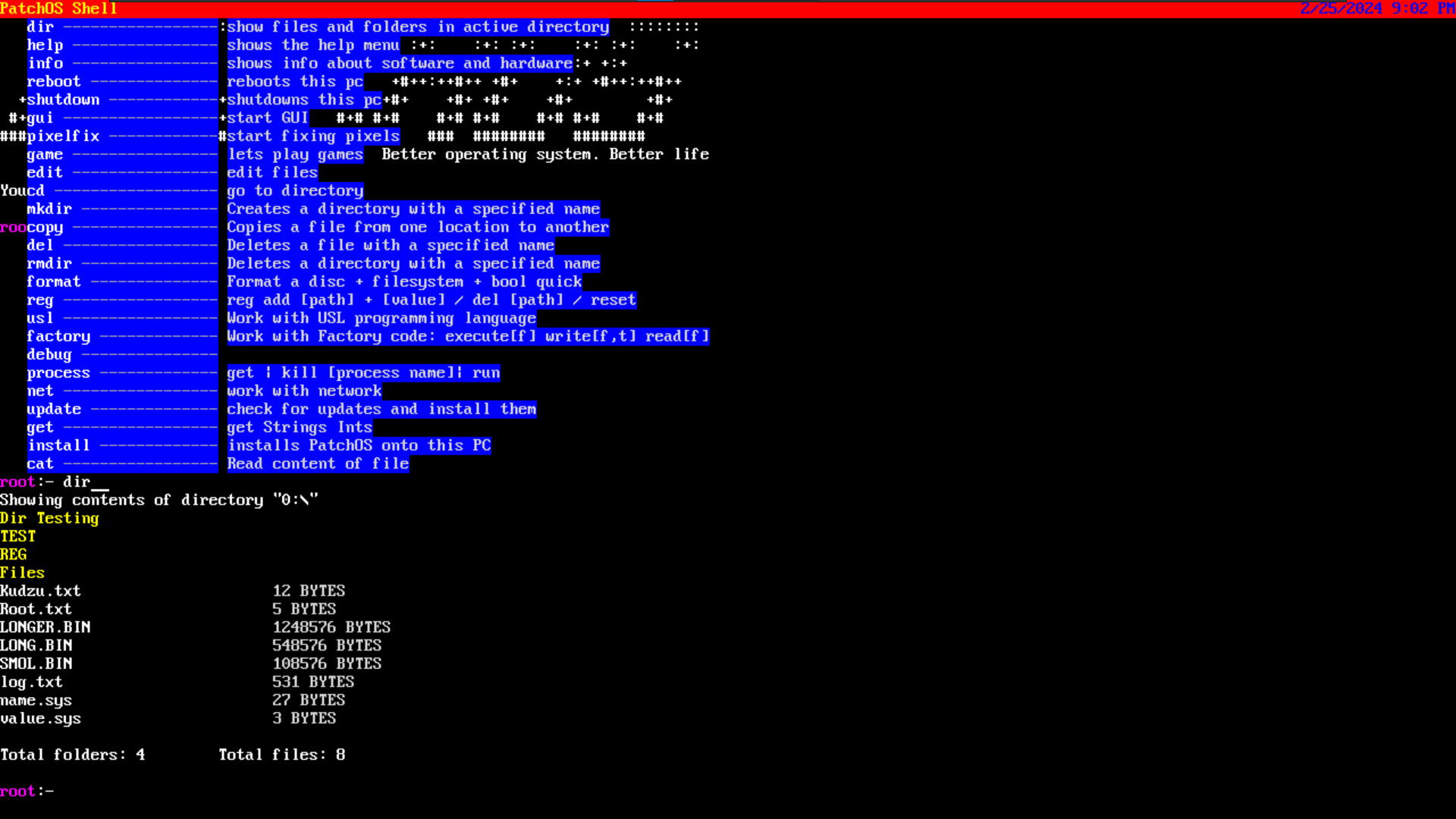Patchos는 완전히 개발되지 않았습니다! 일부 코드는 제대로 작동하지 않을 수 있습니다. 자신의 위험에 따라 실제 하드웨어 에서이 OS를 사용하십시오! 디스크를 손상시킬 수 있습니다! 민감하고 개인 문서에 사용하기에 안전하지 않은 FileSystem