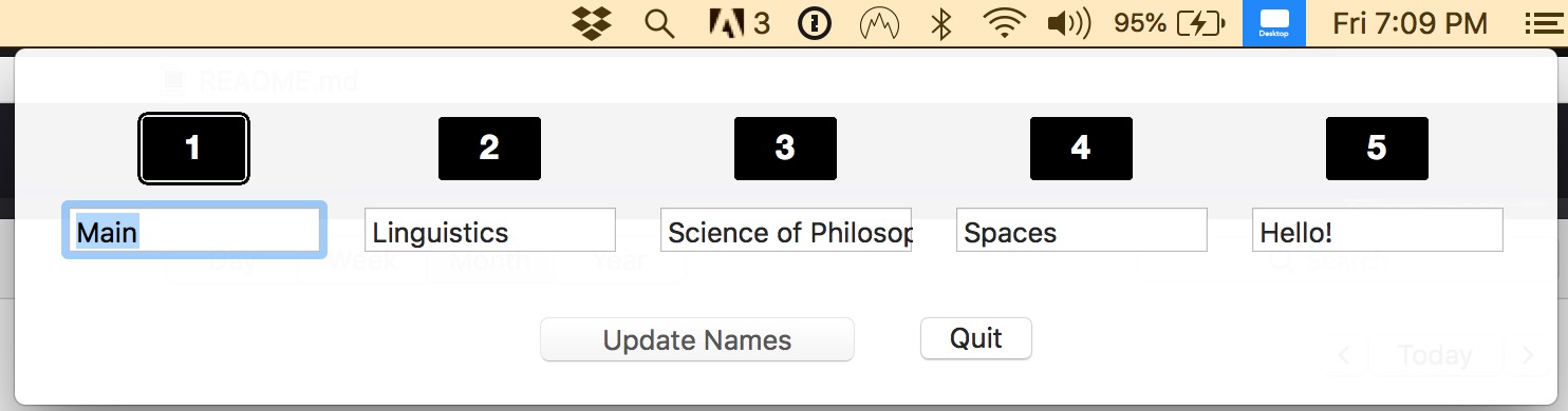 SIMBL 플러그인 및 응용 프로그램입니다. SIMBL 플러그인은 저장된 PLIST에서 공간을 바꾸는 것을 처리합니다. 응용 프로그램은 상태 표시 줄에 아이콘을 추가하여 공백 이름을 바꾸고 PLIST를 업데이트 할 수 있습니다.