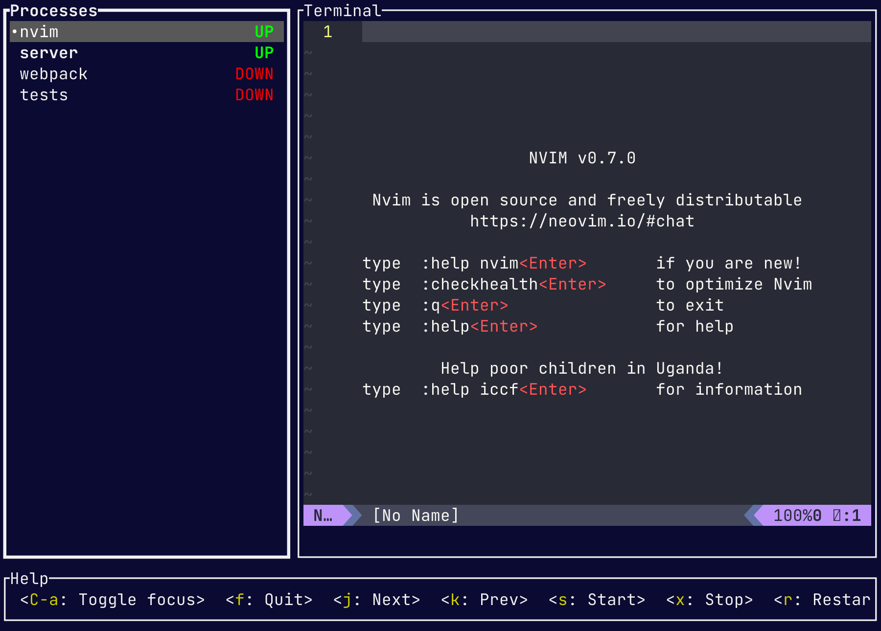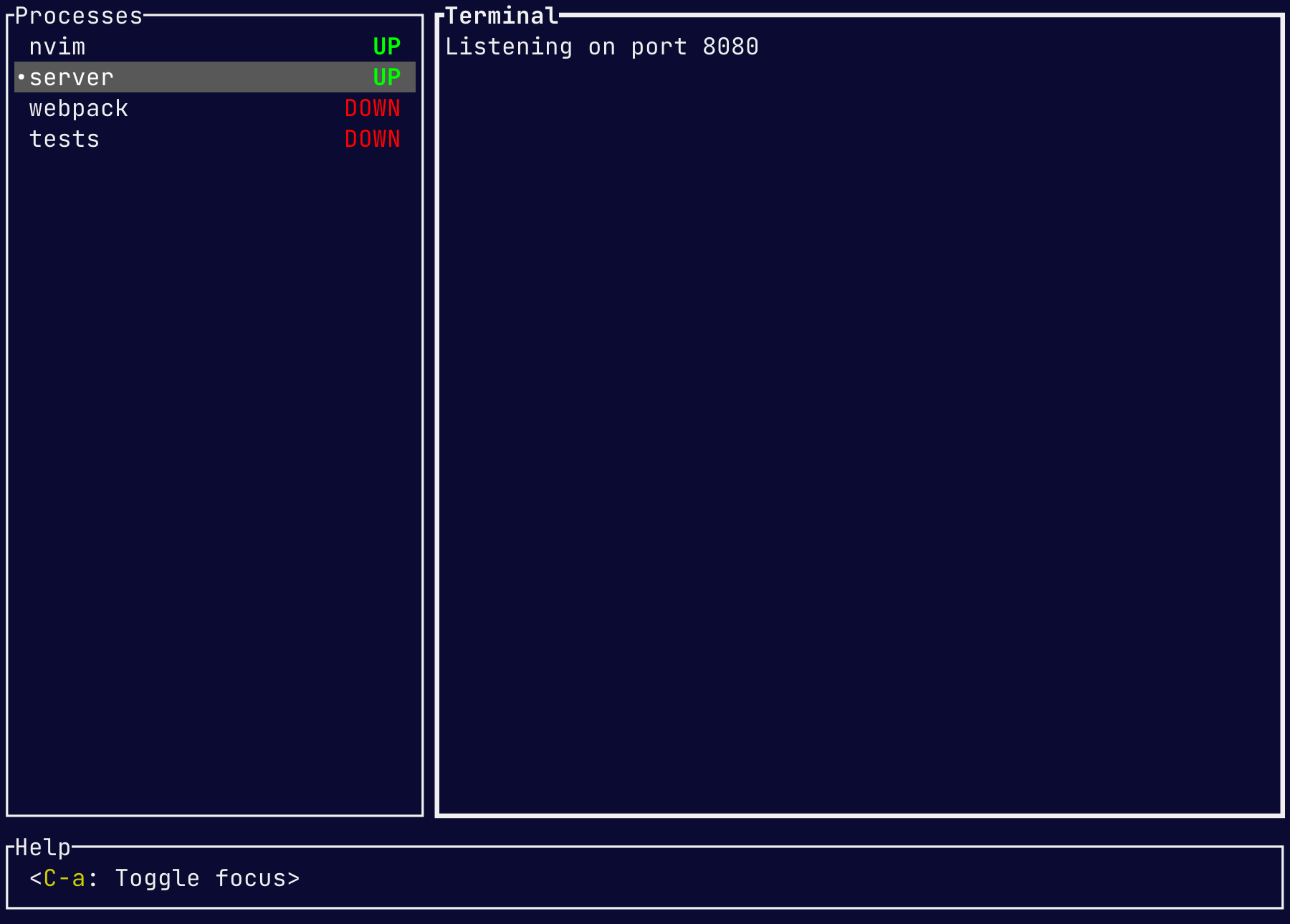 {c: quit-or-ask} -프로세스 중지 및 종료. 프로세스가 실행중인 경우 확인 대화 상자를 표시하십시오.{c: quit} - 프로세스 중지 및 종료. 확인 대화 상자가 표시되지 않습니다.{c: force-quit}{c: toggle-focus} - 프로세스 목록과 터미널 간의 토글 초점.{c: focus-procs} - 포커스 프로세스 목록{c: focus-term} - 포커스 프로세스 터미널 창{c: zoom} - 터미널 창을 확대하십시오{c: next-proc}{c: prev-proc}{c: select-proc, index: <PROCESS INDEX>} - 인덱스별로 프로세스 선택, 최상위 프로세스가 색인 0{c: start-proc}{c: term-proc}{c: kill-proc}{c: restart-proc}{c: force-restart-proc}{c: show-add-proc}{c: add-proc, cmd: "<SHELL COMMAND>"}{c: duplicate-proc}{c: show-remove-proc}{c: remove-proc, id: "<PROCESS ID>"}{c: show-rename-proc}{c: rename-proc, name: "<NEW_NAME>"} - 현재 선택된 프로세스 이름을 바꿉니다{c: scroll-down}{c: scroll-up}{c: scroll-down-lines, n: <COUNT>}{c: scroll-up-lines, n: <COUNT>}{c: copy-mode-enter} -복사 모드를 입력하십시오{c: copy-mode-leave} -복사 모드를 남겨 둡니다{c: copy-mode-move, dir: <DIRECTION> } -선택의 시작 또는 종료 위치 이동. 사용 가능한 지시 사항 : up/right/down/left .{c: copy-mode-end} -선택의 끝점 선택을 시작합니다.{c: copy-mode-copy} -선택한 텍스트를 클립 보드에 복사하고 복사 모드를 남겨 둡니다.{c: send-key, key: "<KEY>"} - 현재 프로세스로 키를 보내십시오. 주요 예 : <Ca> , <Enter>{c: batch, cmds: [{c: focus-procs}, …]} - 여러 명령 보내기 MPROC 는 컴파일러 및 테스트 러너와 같이 반복적으로 실행되는 특정 명령을보다 쉽게 실행할 수 있도록합니다. 이는 일반적으로 각 창/창에서 훨씬 더 오래 지속되는 프로세스 (일반적으로 쉘)를 실행하는 데 사용되는 TMUX 와 대조적입니다. 또 다른 차이점은 TMUX가 서버와 클라이언트를 실행하여 클라이언트가 나중에 분리하고 다시 시작하여 프로세스를 실행할 수 있다는 것입니다. MPROCS는 다시 실행하는 유한 평생 프로세스를위한 것이지만 MPROCS가 끝나면 Windows 내에서 실행되는 프로세스도 마찬가지입니다.