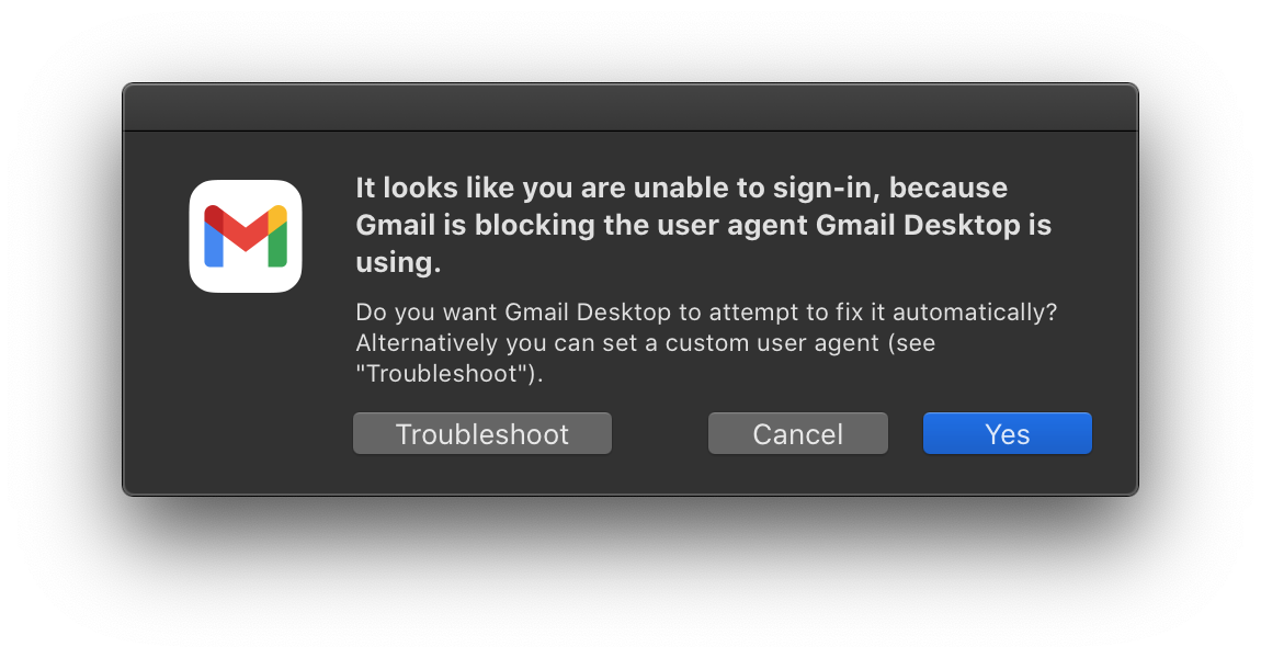 Gmail Desktop은 위의 문제가 발생할 때 사용자 에이전트를 자동으로 수정하려고 시도합니다.