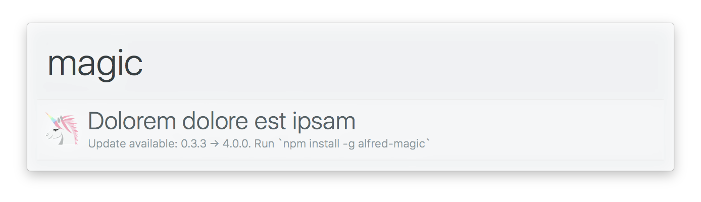npm install --global alfred-unicorn팁 : 모든 워크 플로우를 수동으로 업데이트하는 대신 Alfred-Updater 워크 플로우를 사용하여이를 수행하십시오.