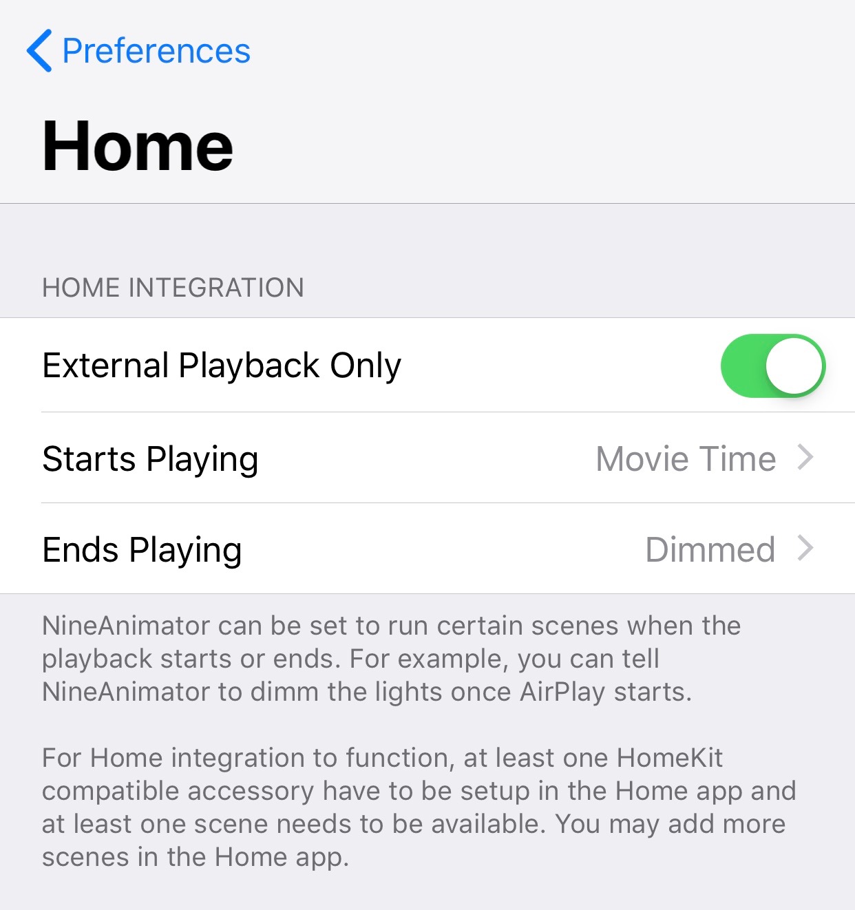 NineAnimator는 재생이 시작될 때 홈 장면을 실행하도록 구성 할 수 있습니다. 기본 동작은 비디오가 외부 화면에서 재생 될 때만 장면을 실행하는 것입니다 (예 : Google 캐스트, AirPlay). 그러나 Settings -> Home 패널에서 변경할 수 있습니다.
