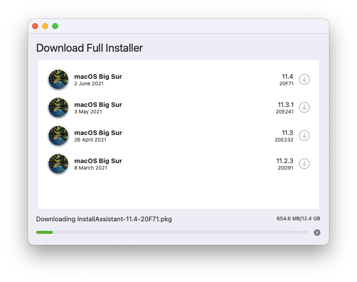 Apple은 Big Sur를위한 설치 프로그램 PKG 만 제공합니다. Big SUR 설치 프로그램의 이전 버전은 정기적으로 제거됩니다.