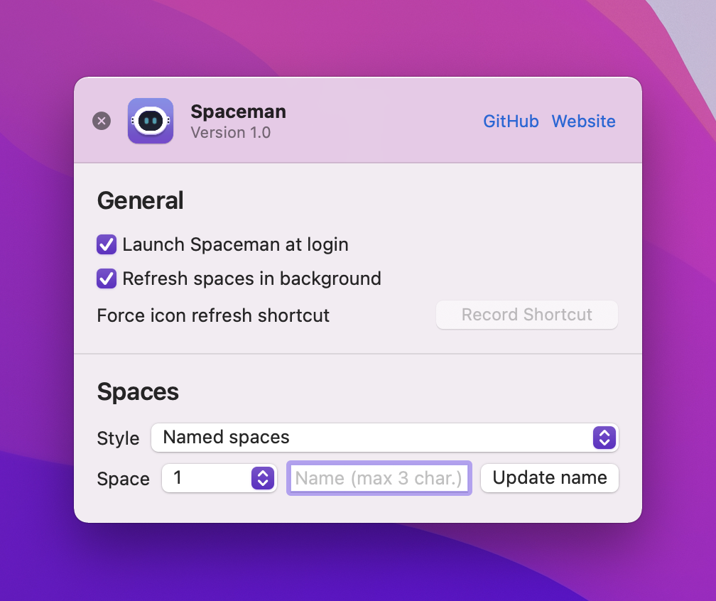 SPACEMAN은 메뉴 표시 줄에서 공백 / 가상 데스크톱을 볼 수있는 MACOS 응용 프로그램입니다. SPACEMAN을 사용하면 현재있는 다른 공간에 비해 현재 어떤 공간 (또는 여러 디스플레이를 사용하는 경우 공간)을 확인할 수 있습니다. 이 공간의 이름 지정은 워크 플로우에 대한 별도의 공간을 구성하는 옵션입니다.