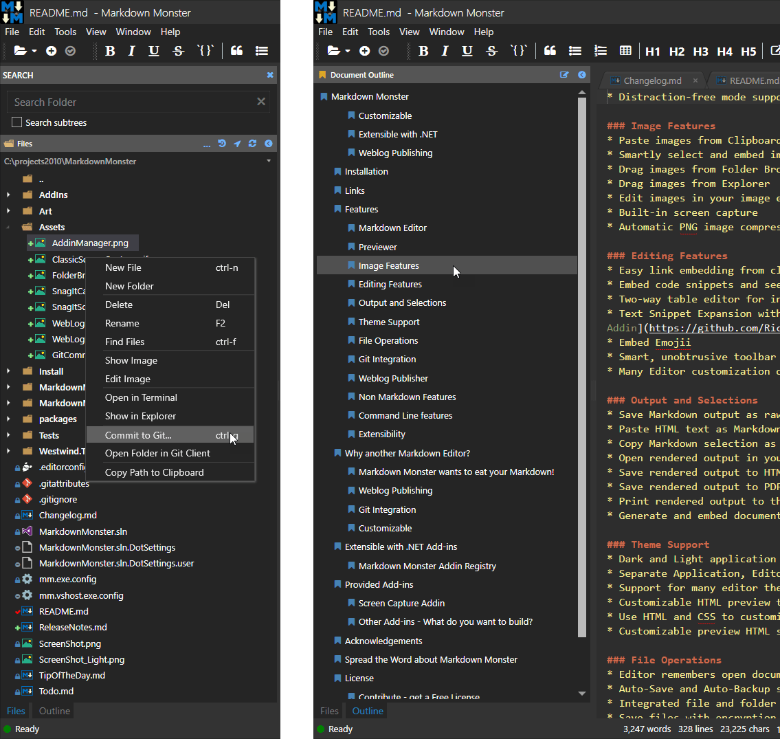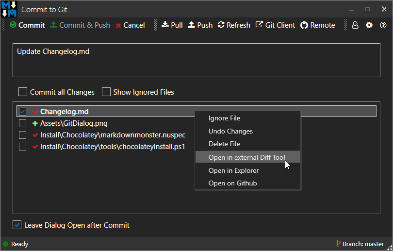 요즘 Markdown과의 협력은 종종 GIT 리포지토리와 함께 작업하고 Markdown Monster는 편집 중에 수행 해야하는 일반적인 GIT 작업을 통합합니다. 새로운 저장소의 복제 및 작성뿐만 아니라 변경 사항을 쉽게 검토, 커밋 및 추진할 수 있습니다.