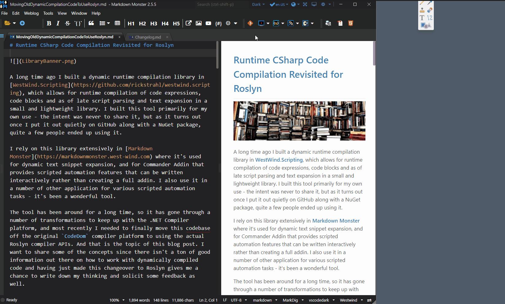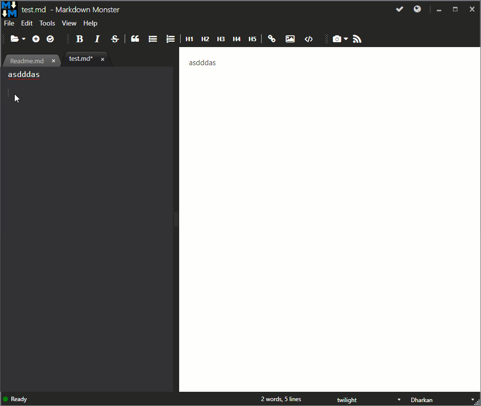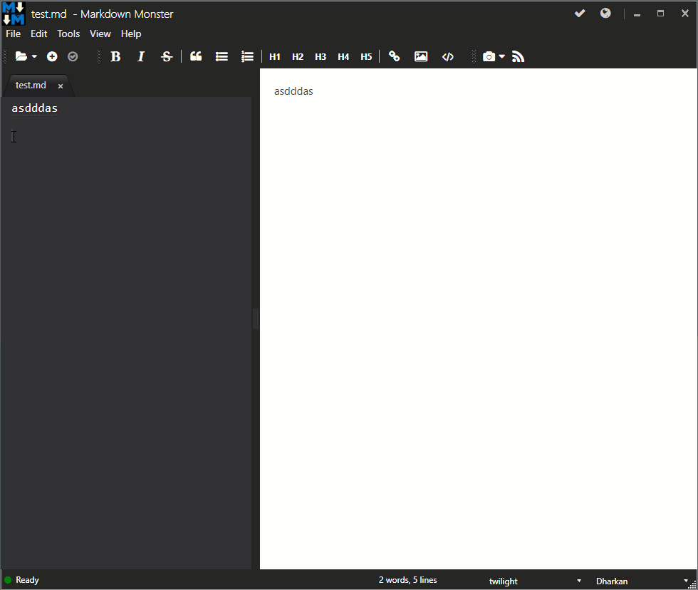Markdown Monster가 기본 Dark 테마를 사용하는 모습은 다음과 같습니다.