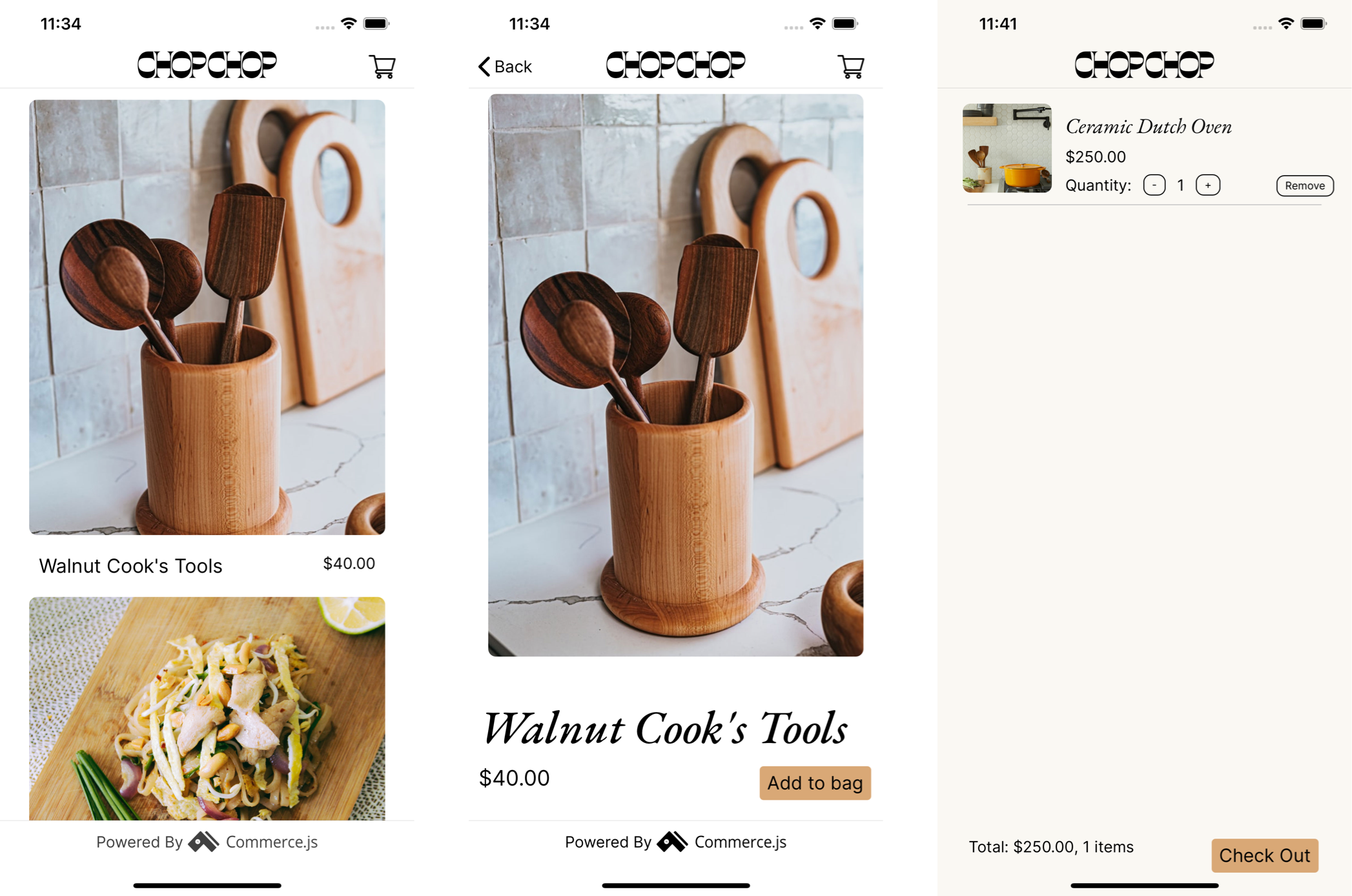 Chopchop은 아름답게 디자인되고 우아하게 개발 된 데모 스토어 및 스타터 키트로 사려 깊은 요리사를위한 훌륭한 도구를 판매합니다. 우리는 상업 경험이있는 프리미엄 브랜드를 만들었습니다. Commerce.js 블로그 에서이 리소스에 대해 자세히 알아보십시오.
