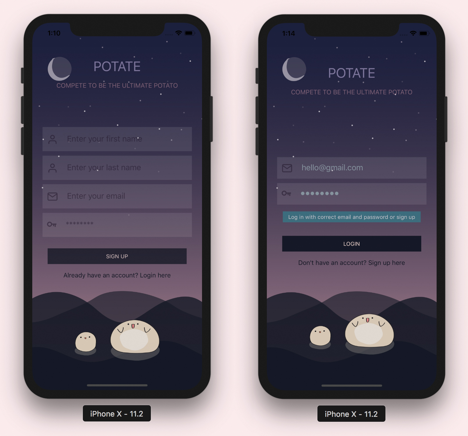 사용자가 Potate를 처음 열면 로그인 페이지를 방문합니다. 이 페이지는 사용자에게 기존 계정을 사용하여 로그인하거나 새 계정으로 가입하라는 메시지를 표시합니다. 신규 사용자는 이름, 성, 이메일 및 비밀번호의 네 가지 주요 필드를 작성해야합니다.