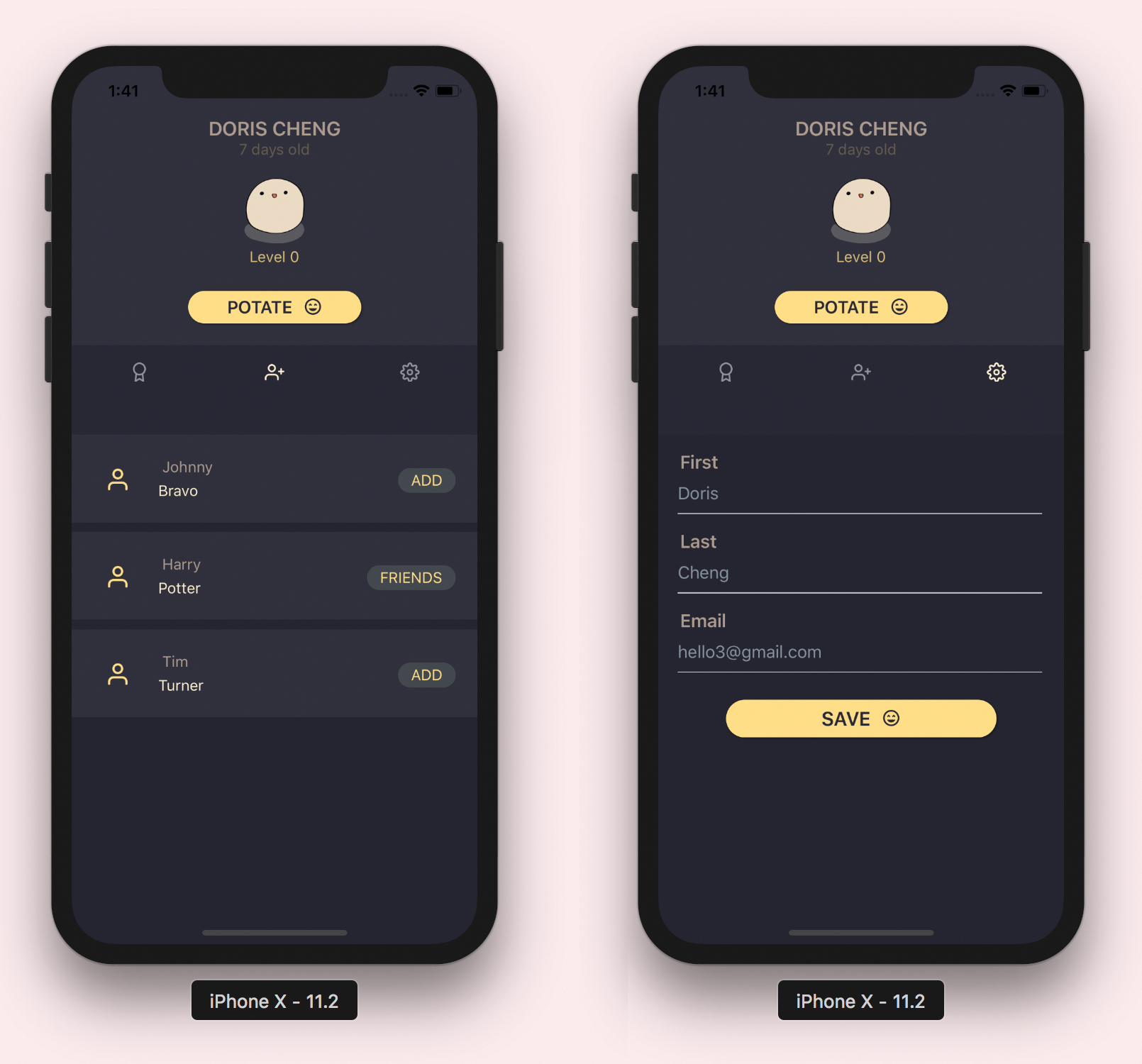 Potate에 로그인 한 후 사용자는 자신의 사용자 프로필을 볼 수 있습니다. 상단에는 자신의 이름, 감자 이미지 및 사용자의 현재 레벨이 표시됩니다 (모든 신규 사용자는 아기 감자의 이미지로 시작하고 레벨은 0으로 설정됩니다). 사용자는 친구를 만나고 Potate의 다른 사용자 인 새로운 친구를 추가 할 수 있습니다. 사용자는 설정으로 이동하여 계정 정보를 변경할 수도 있습니다.