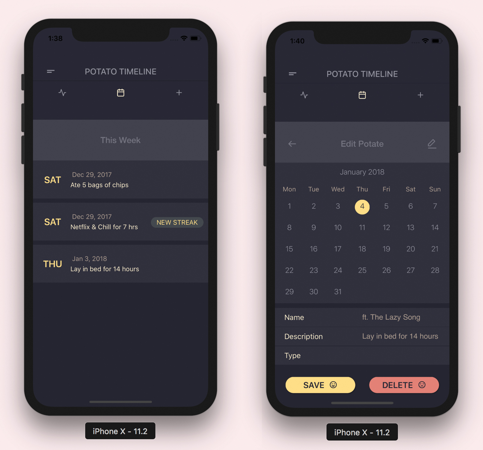 Potate는 사용자의 게으름을 추적하는 모바일 앱입니다. React Native App을 만들어 냈으며 React Native 요소 덕분에 Android 및 IOS와 완전히 호환됩니다. FireBase는 백엔드 (서버 및 사용자 인증)에 사용되었습니다.