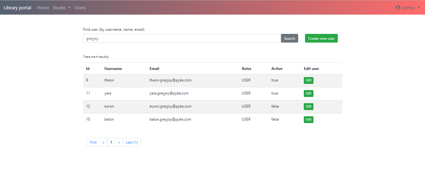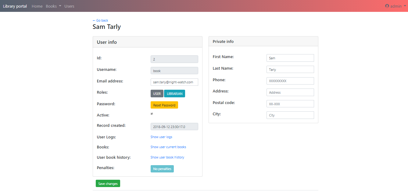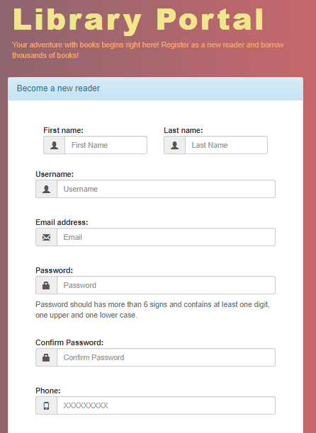 이것은 도서관 웹 사이트의 구현 인 첫 번째 Spring MVC 프로젝트입니다. 이 응용 프로그램은 책 (표준 사용자로서)을 빌려서 책 인벤토리를 관리 할 수 있습니다 (새 제품 추가, 가용 확인 등) 및 사용자 계정.