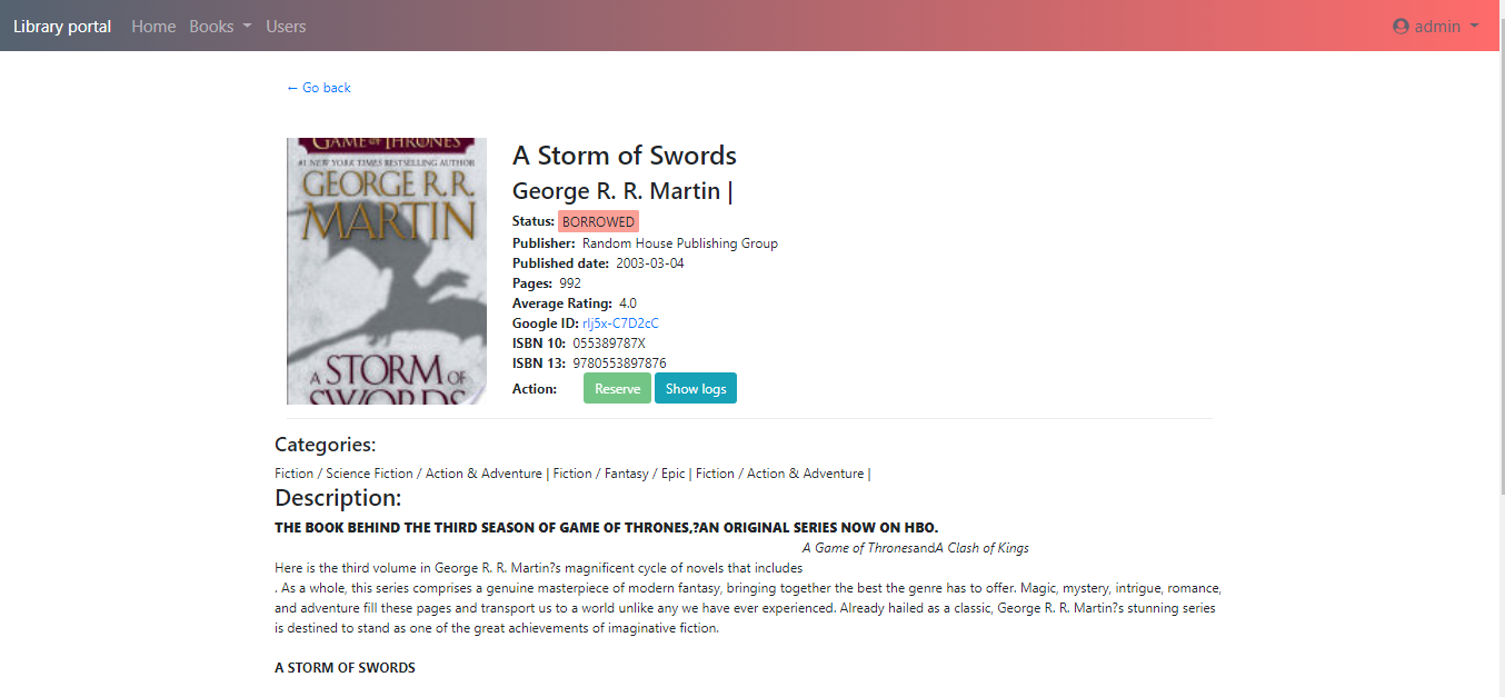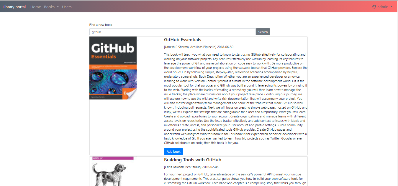 사서는 도서관에 새 책을 추가 할 수 있습니다. 검색 쿼리가 수행되면 새로운 책 데이터가 Google Book API에서 가져옵니다.