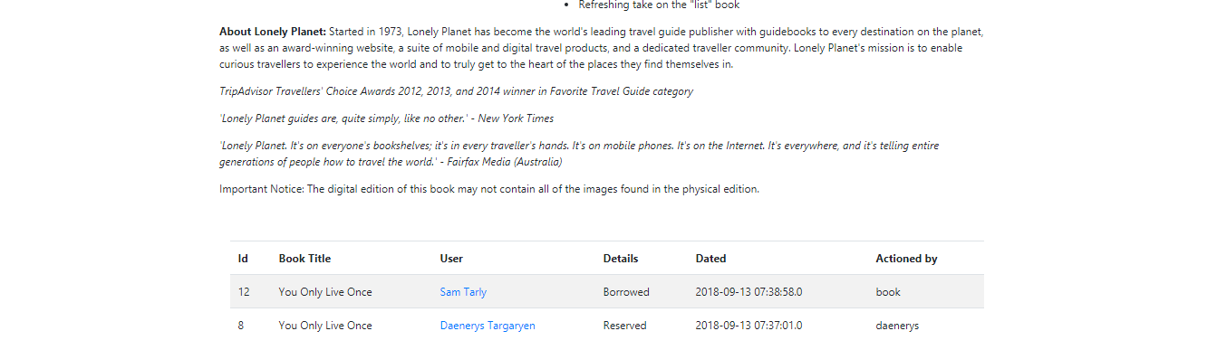 사서는 책을 빌려서 책을 반환 할 수 있습니다. 또한 그는 책 역사를 확인하여 책에서 어떤 행동을할지 통찰력을 얻을 수 있습니다.