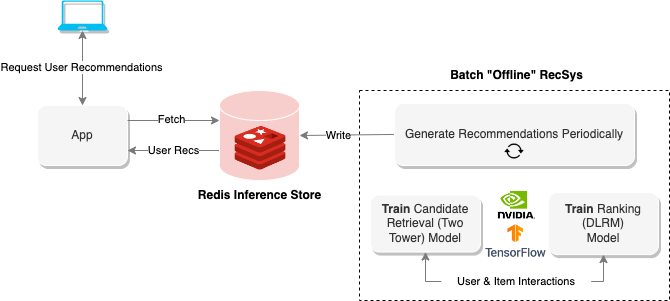 "오프라인"권장 시스템은 배치 컴퓨팅을 사용하여 대량의 데이터를 처리 한 다음 나중에 검색 할 수 있도록 저장합니다. 위의 다이어그램은 2 타워 접근 방식을 사용하여 권장 사항을 생성 한 다음 나중에 검색하기 위해 Redis 데이터베이스 내에 저장하는 시스템의 예를 보여줍니다.