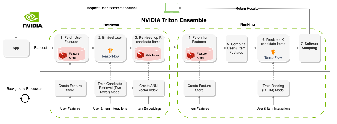 우리는 추천 시스템 아키텍처의 예를 제공하고 생산 사용을위한 클라우드 배포 지침을 제공합니다. 각 예제는 Redis 및 Nvidia Merlin 프레임 워크에 의존하여 권장 시스템을 만들기위한 여러 빌딩 블록을 제공합니다.