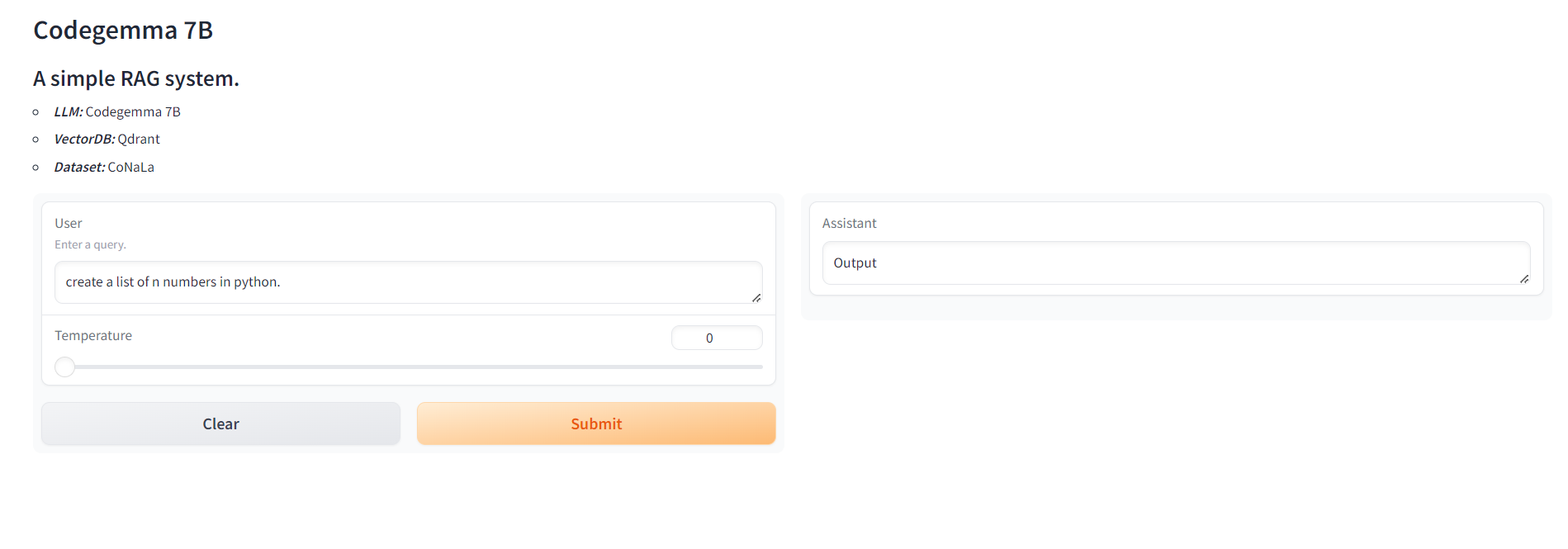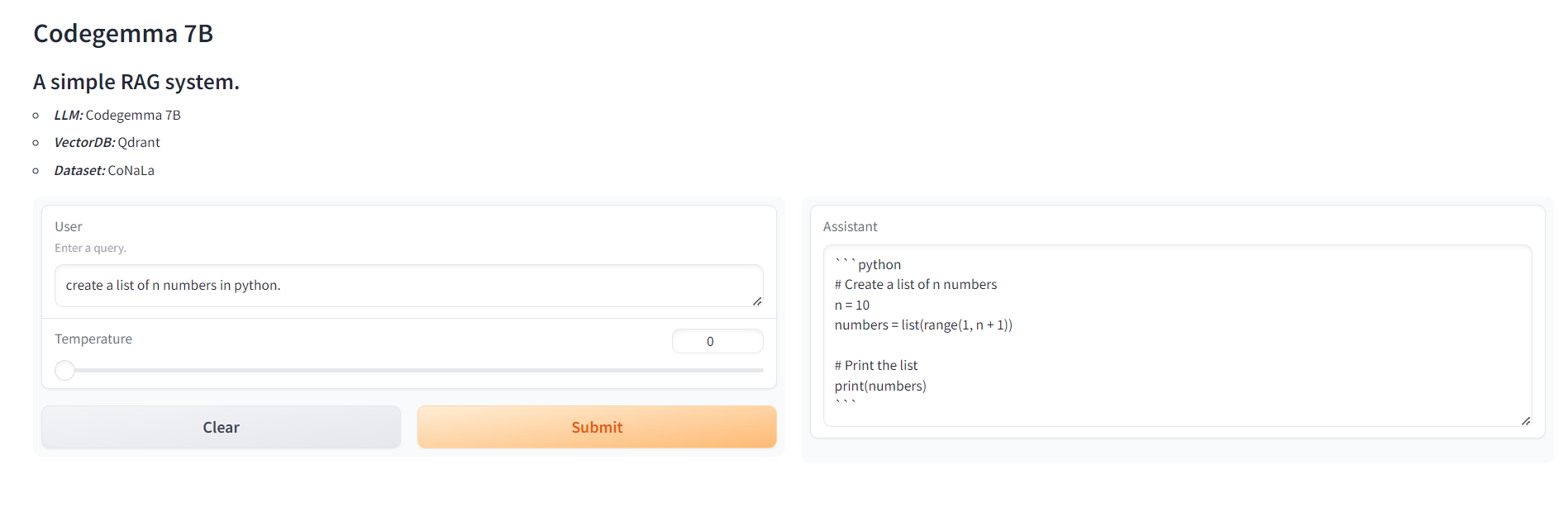 이 작업은 GoogleCodegemma:7b , Qdrant as VectorDB 및 CoNaLa 데이터 세트로 간단한 걸레 시스템을 구현합니다. GRADIO 와 함께 간단한 앱을 개발하고 Conatiner 런타임을위한 Dcoker 이미지를 만듭니다.