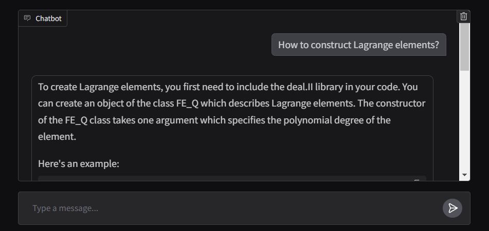 LLM의 가장 강력한 응용 중 하나는 특정 소스 정보를 기반으로 정확한 답변을 제공 할 수있는 정교한 질문 응답 (Q & A) 챗봇을 만드는 것입니다. 이 프로젝트는 RAG (Restrieval-Augmented Generation)로 알려진 기술을 사용하여 오픈 소스 C ++ 유한 요소 라이브러리 인 Deal.ii Library를 개발하는 데 중점을 둡니다. 데이터 세트는 공식 거래에서 사용 가능한 90 개의 튜토리얼 단계에서 제공됩니다. 여기에서 액세스 할 수 있습니다. LLM (Large Language Model) 엔진은 Cohere에서 제공하며 임베딩 및 채팅 서비스를위한 고품질 LLM 모델을 제공하는 것으로 알려져 있습니다. 벡터 데이터베이스의 경우 벡터 검색 및 검색의 오픈 소스 특성, 속도 및 효율성으로 인해 Chroma를 선택했습니다. Langchain 프레임 워크는 사용자의 입력, 쿼리 처리 및 벡터 데이터베이스의 관련 정보 검색 간의 상호 작용을 효율적으로 관리하는 데 사용되어 모델의 다양한 구성 요소 간의 완벽한 통합을 보장합니다.