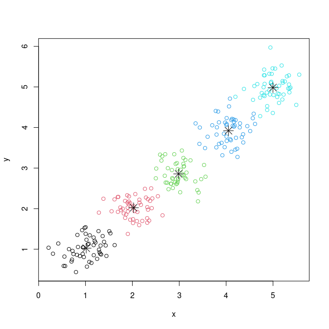 remotes :: install_github( " tanaylab/tglkmeans " )library( tglkmeans )SD는 0.3으로 1 ~ 5 정도의 5 개의 클러스터를 생성합니다.