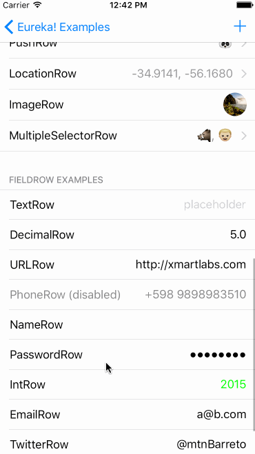 section += [ TextRow ( ) , DateRow ( ) ]Eureka에는 결과 제작자가 포함되어있어 형태를 쉽게 만들 수 있습니다.