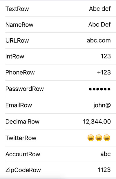 } 또한 FieldRow 하위 유형에는 useFormatterOnDidBeginEditing 속성이 있습니다. 소수점 값을 허용하고 사용자의 로케일 (예 : DecimalFormatter )을 준수하는 형태로 DecimalRow 사용하는 경우, useFormatterDuringInput 이 false 인 경우, useFormatterOnDidBeginEditing 편집 된 값의 소수점 마크가 키보드의 소수점 마크와 일치 true 설정해야합니다.