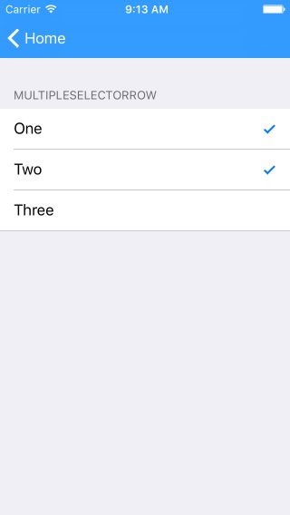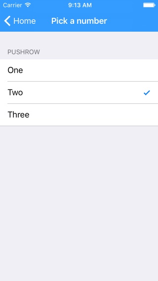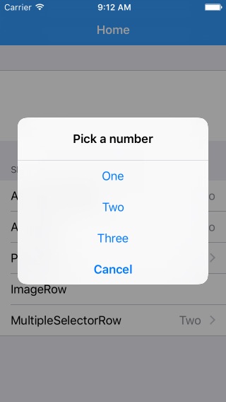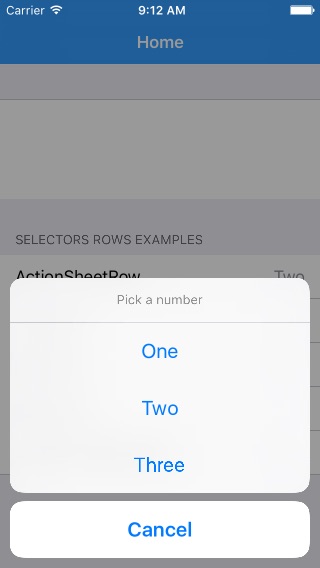 } 경고 행![]() 선택할 수있는 옵션에 대한 경고가 표시됩니다. | 액션 시트 행![]() 선택할 수있는 옵션이 포함 된 액션 시트가 표시됩니다. | 푸시 행![]() 확인 행을 사용하여 나열된 옵션을 선택할 곳에서 새 컨트롤러로 푸시됩니다. | 다중 선택기 행![]() Pushrow와 마찬가지로 여러 옵션을 선택할 수 있습니다. |