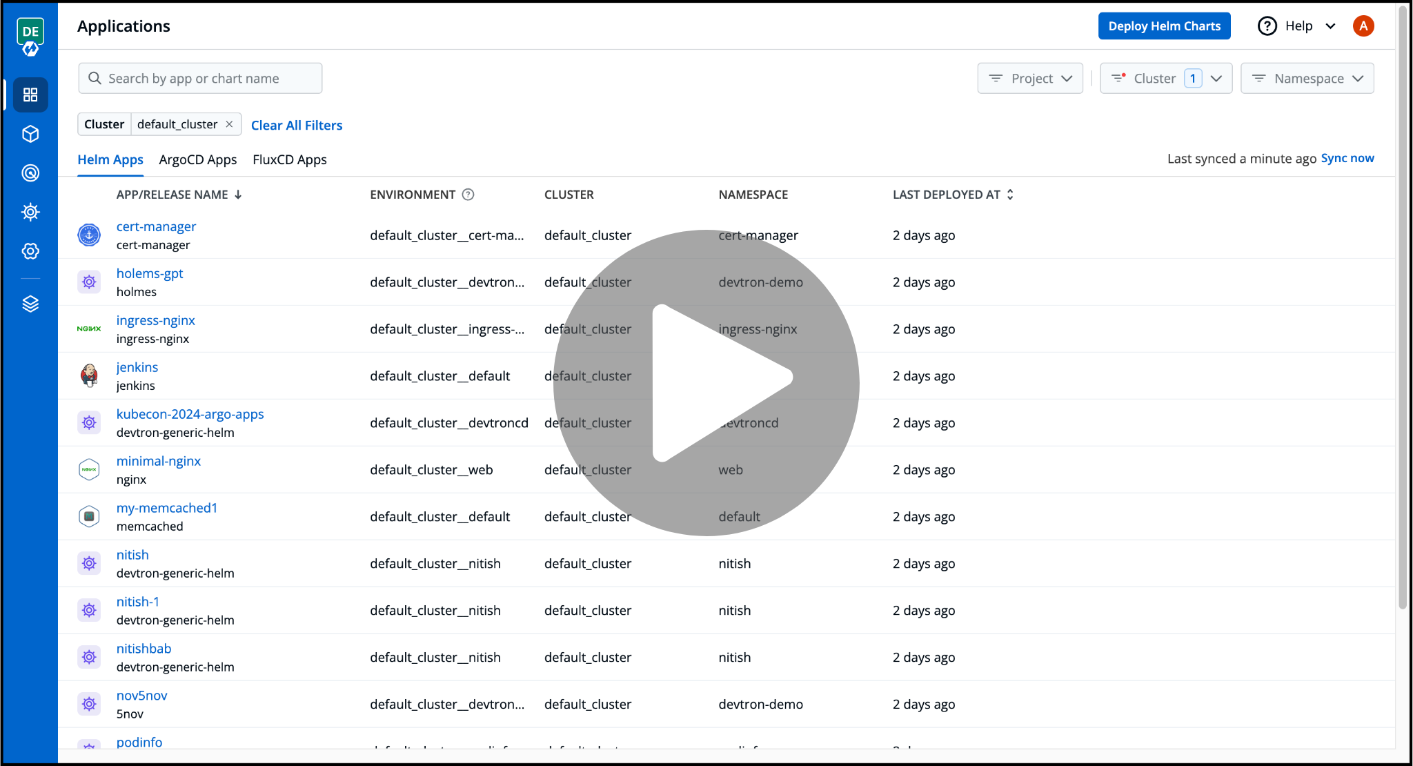 DevTron은 모든 클러스터에 기존 헬름 앱을 배포, 관찰, 관리 및 디버그하는 데 도움이됩니다.