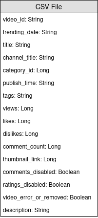 videos<region>Repository 와 같은 일반 이름을 알려주십시오.Factory 의 출력을 작성하기위한 구성 객체를 설정하는 것을 잊지 마십시오. entity 폴더에서 Video 라는 케이스 클래스를 만듭니다. 이제 비디오 파일에서 필요한 필드를 검사하십시오. 목표는 인기 점수를 계산하는 것이며, 공식은 number of views * views weight + number of trending days * trending days weight + normalized likes percentage * likes weight + normalized comments * comments weight 상기시킵니다. 필드를 선택하는 데 도움이됩니다.