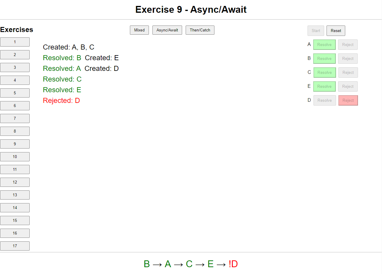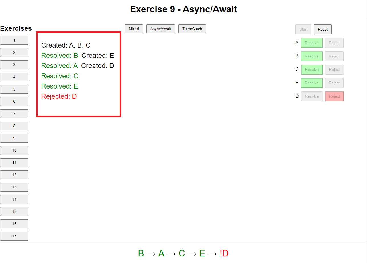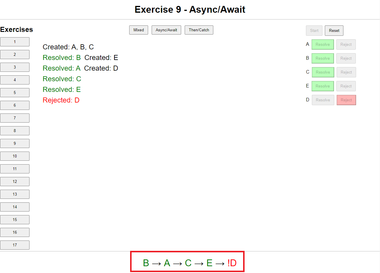 await createPromise ( "C" ) ;마지막으로, 약속에는 두 가지 가능한 결과가 있습니다. 이는 성취되거나 거부 될 수 있습니다.