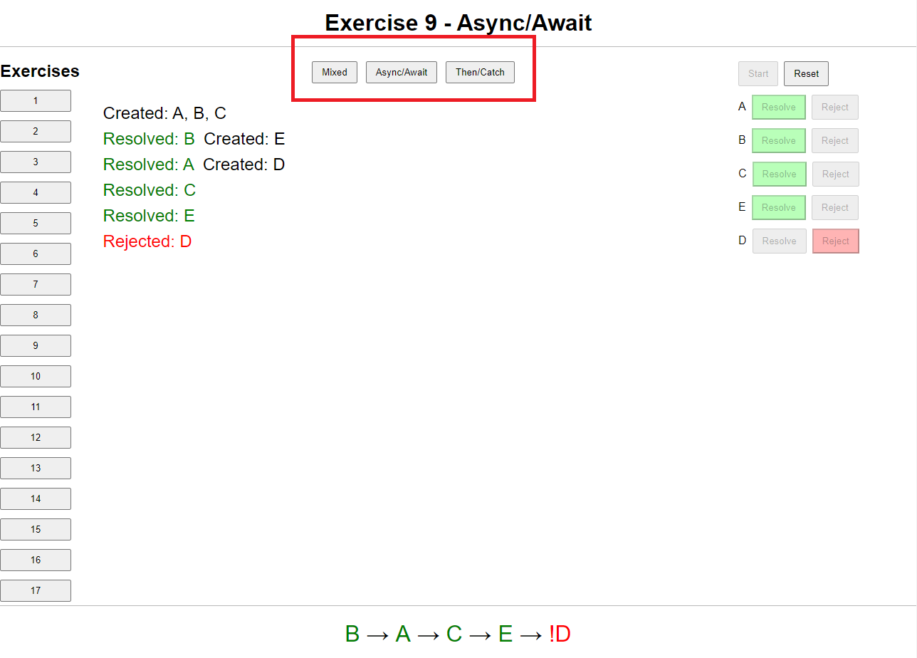 이 세 가지 각각에 대한 솔루션을 구현할 때 테스트를 실행하려는 구현을 위해 skipExercise Call을 제거하십시오. 예를 들어, mixed 솔루션을 이미 구현 한 경우 skipExercise 를 제거하지만 구현할 때까지 asyncAwait 및 thenCatch 의 용액을 보관하십시오.