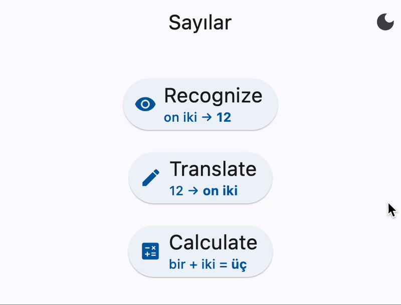 이 응용 프로그램에는 터키 숫자를 인식하고 사용하는 연습을위한 간단한 연습이 있습니다. 그것은 단지 작은 측면 프로젝트이기 때문에 가능한 한 최소화하는 것을 목표로합니다. 터키어를 배우고 숫자를 연습 할 수있는 더 나은 방법을 원했습니다.