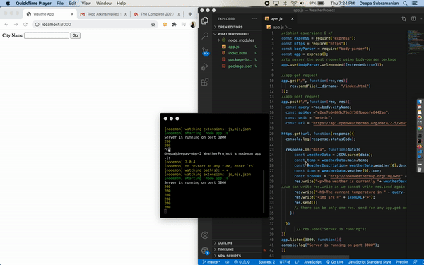 - 프로젝트 7 : 날씨 앱 -Node.js 및 Express.js. 이 프로젝트는 외부 날씨 API를 사용하여 게시물 요청이 전송 된 후 날씨 데이터를 얻기 위해 전화를 걸었습니다.