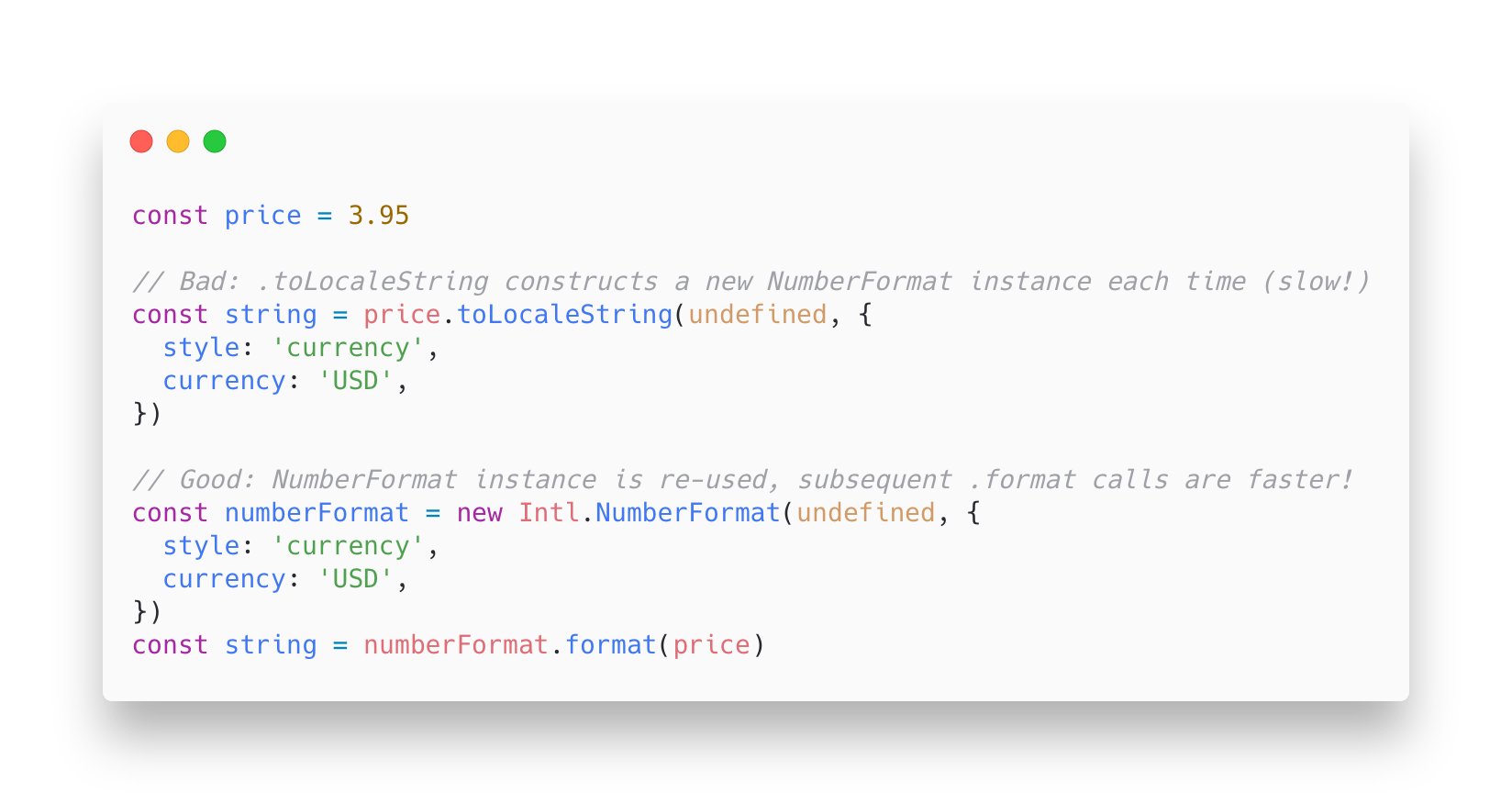 사용자에게 숫자를 제시 할 때는 숫자를 올바른 로케일 (쉼표, 통화 부호 등으로 포맷해야하지만 .tolocalestring (..)은 작업을 수행하는 반면 실제로 자신의 NumberFormat 인스턴스를 구성하여 성능을 ~ 2x로 향상시킬 수 있습니다!