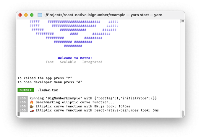 다수를 다룰 때는 JS 기반 라이브러리 대신 React-Native-Bignumber를 사용하십시오. ⚡️ 순수한 C ++ 구현으로 뒷받침되며 특정 응용 프로그램에서 BN.JS보다 ~ 330 배 빠릅니다 (예 : #Crypto Apps, Ethers.js, Elliptic, Bitcoin)