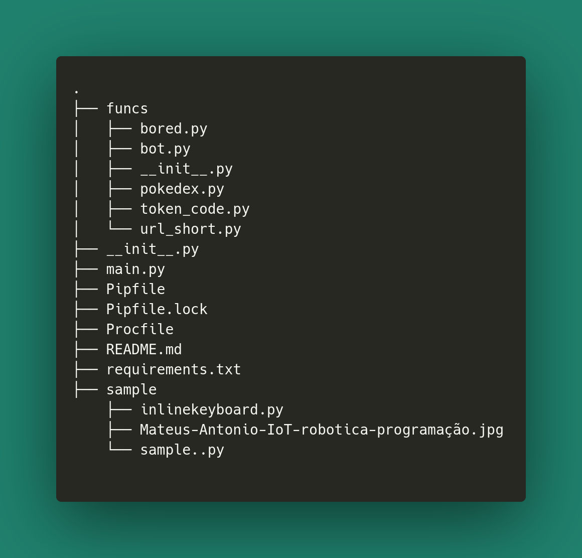 sample/ 에는 sample.py 및 inlinekeyboard.py 파일이 있습니다. Sample.py는 라이브 시작시 봇에서 첫 번째 테스트를 수행하여 일부 속성을 발견하고 검증하기 위해 Python Work의 Telegram Library의 기능을 테스트합니다. 모든 것이 하나의 파일에 있으므로 지저분하고 분리하기가 어렵 기 때문에 funcs/ 채택되었습니다. inlinekeyboard.py 에서는 예제가 라이브러리 문서에서 직접 가져 왔으며, Telegram 채팅의 키/버튼을 테스트하여 지루한 API의 기능을 구현했습니다.