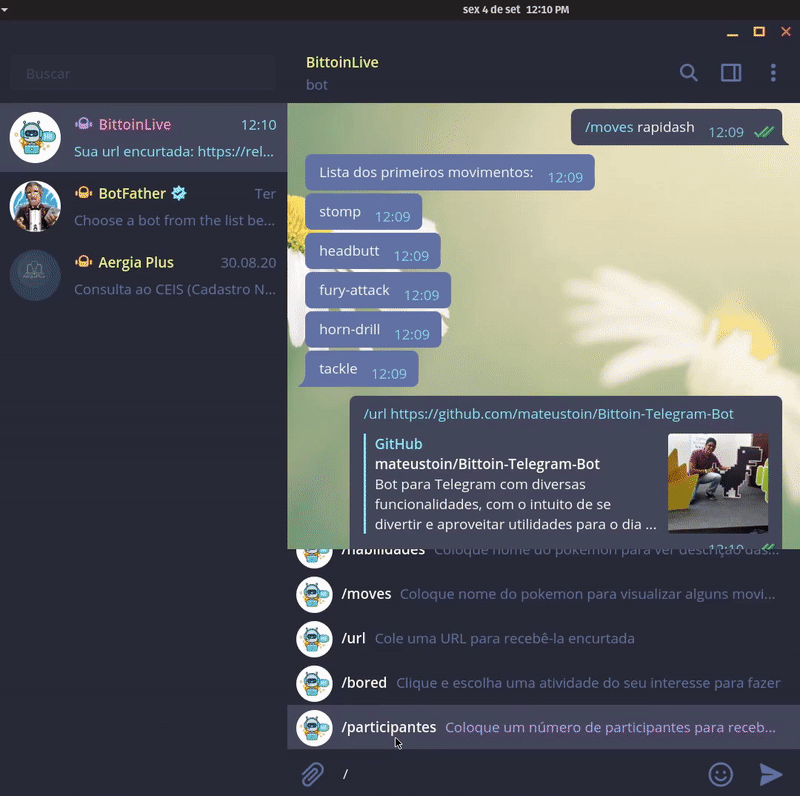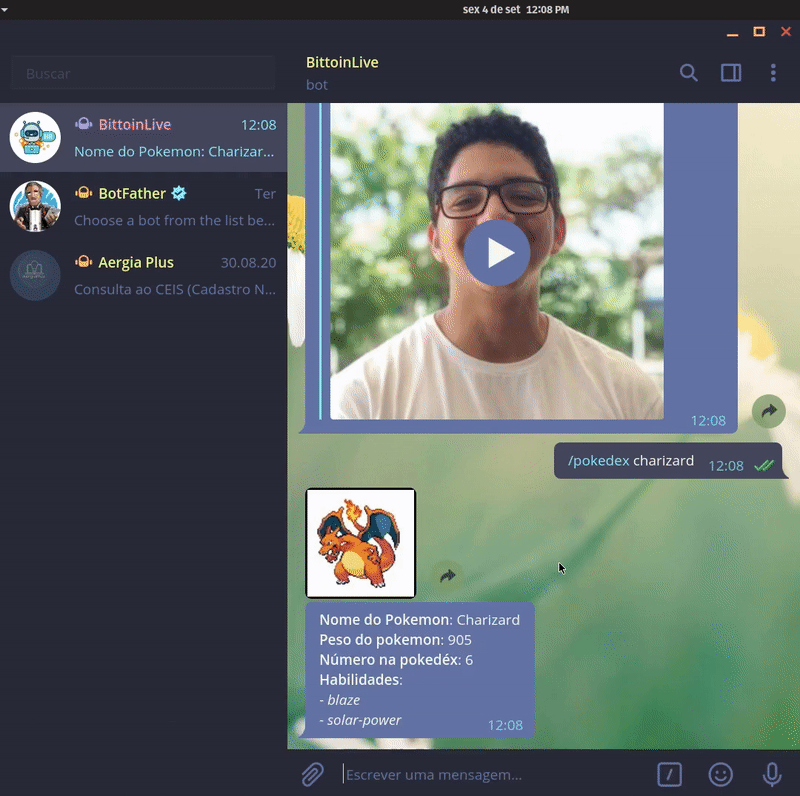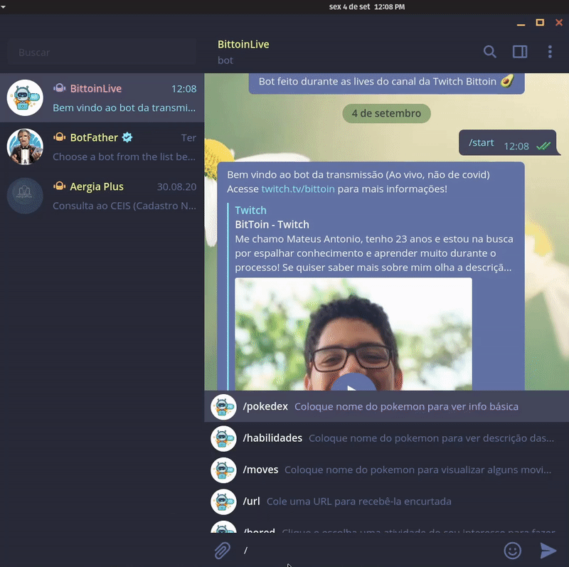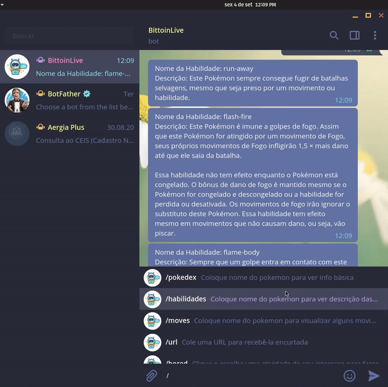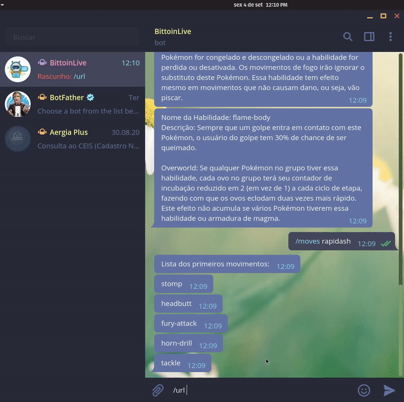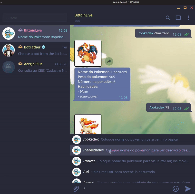 pokedex_handler = CommandHandler ( 'pokedex' , self . pokedex . pokedex ) 첫 번째 인수는 채팅에서 호출 될 명령의 이름이고 두 번째는 작동 할 때 호출 될 메소드입니다. 그 후 우리는 모든 사용자 요청에 응답하고 내부 통화 조직을 유지하기 위해 모든 생성 된 핸들러를 관리하고 작동시키는 BOT의 dispatcher 사용합니다.