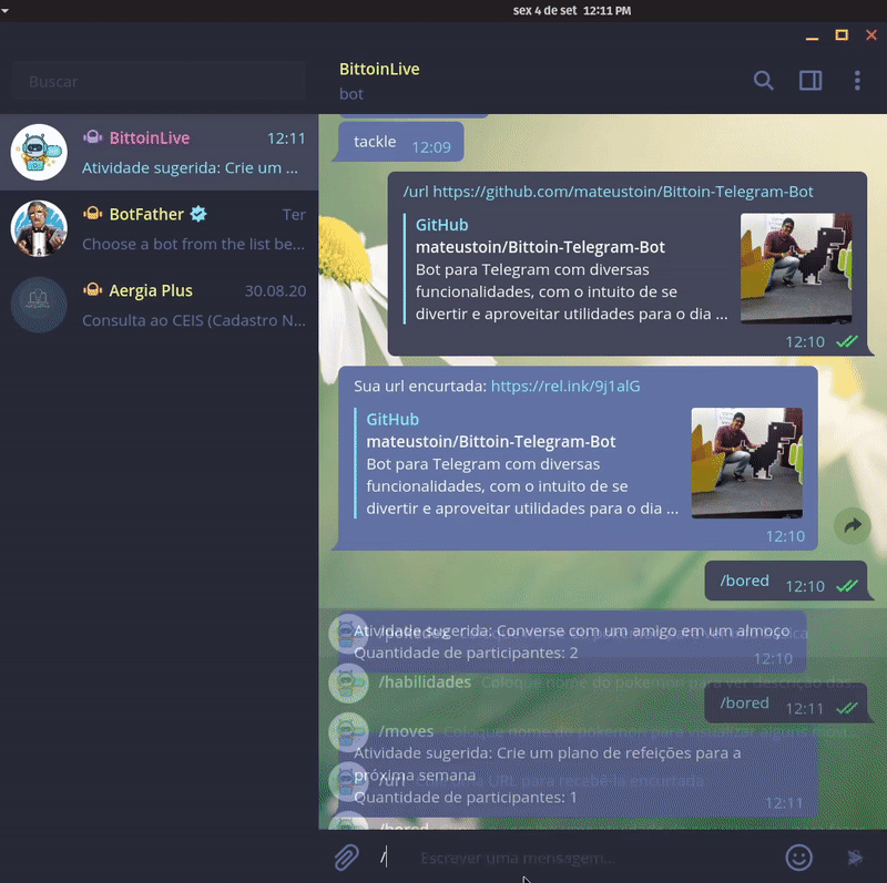 이 섹션에서는 각 기능에 대한 BOT 및 사용 사례로 얻은 결과가 표시됩니다. 전보에 봇을 즐기고 추가하십시오! @BittoinLiveBot 찾아 채팅에서 명령을 입력하기 만하면됩니다.