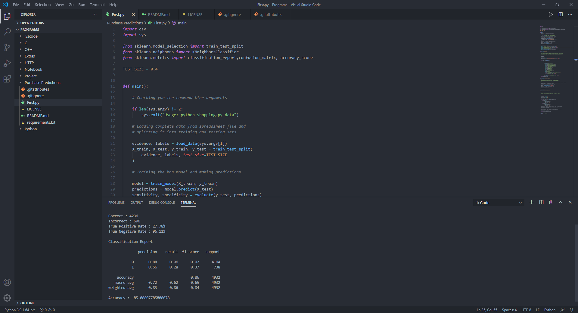 labels . append ( 1 if row [ "Revenue" ] == "TRUE" else 0 )절차에는 데이터 세트를 가져 와서 두 개의 서브 세트로 나누는 것이 포함됩니다. 첫 번째 서브 세트는 모델에 맞는 데 사용되며 교육 데이터 세트라고합니다. 두 번째 서브 세트는 모델을 훈련시키는 데 사용되지 않습니다. 대신, 데이터 세트의 입력 요소가 모델에 제공되면 예측이 이루어지고 예상 값과 비교됩니다. 이 두 번째 데이터 세트는 테스트 데이터 세트라고합니다. 그런 다음 Sklearn 모듈에서 TRAIN_TEST_SPLIT () 함수를 사용하여 모델에 대한 교육 및 테스트 데이터를 준비합니다.