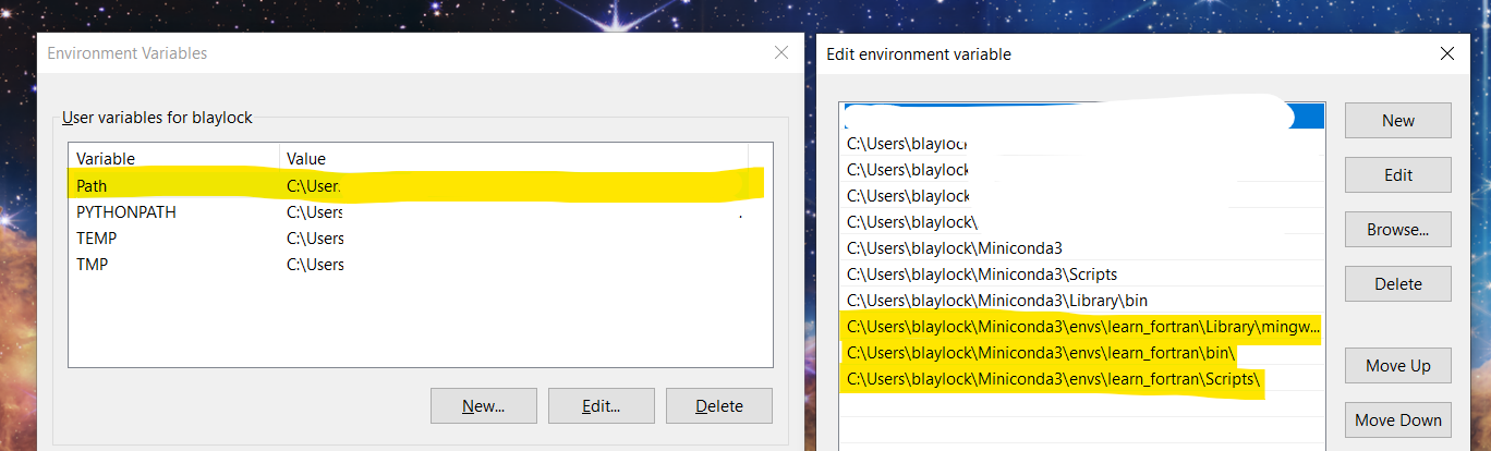 where fprettify Windows Key 누르고 Edit environment variables for your account 검색하고 열 수 있습니다. Path 줄을 클릭하고 Edit . 그런 다음 New 클릭하고 gfortran , fortls , findent 및 fprettify 의 경로를 입력하십시오. 이 세 줄과 같은 것이 있어야합니다.