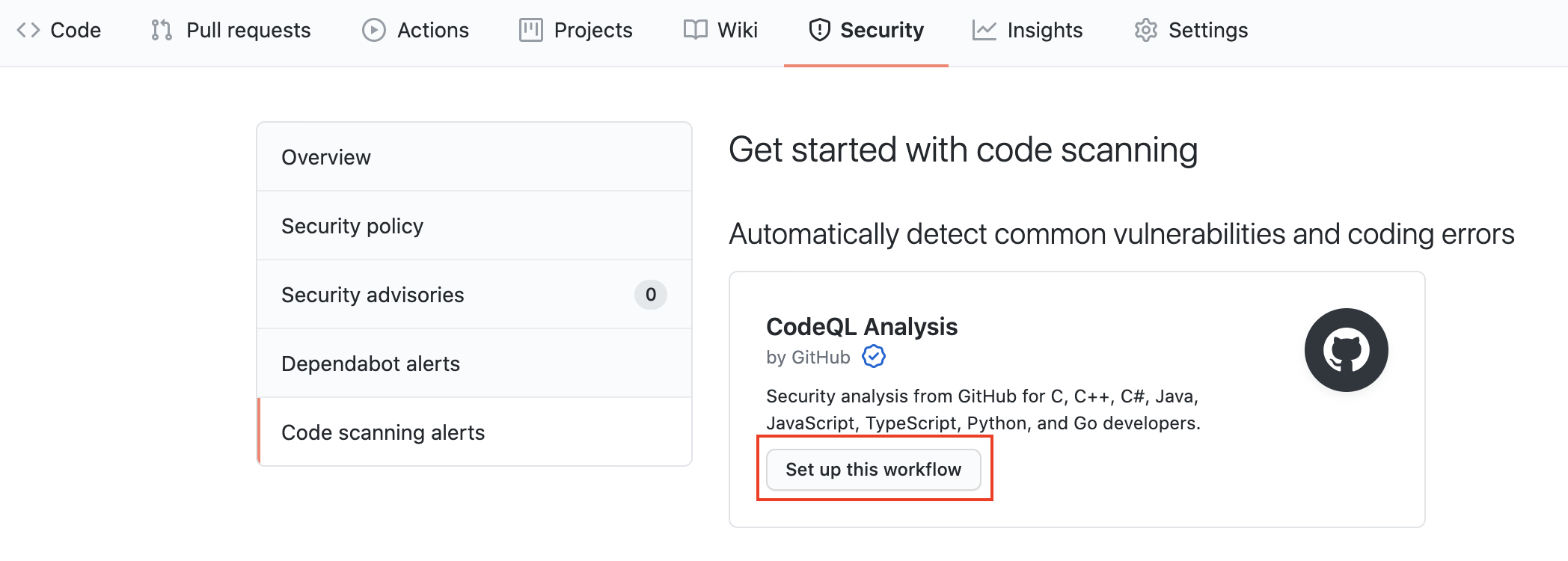 CodeQL Analysis 에서이 Setup this workflow 버튼을 클릭하십시오.