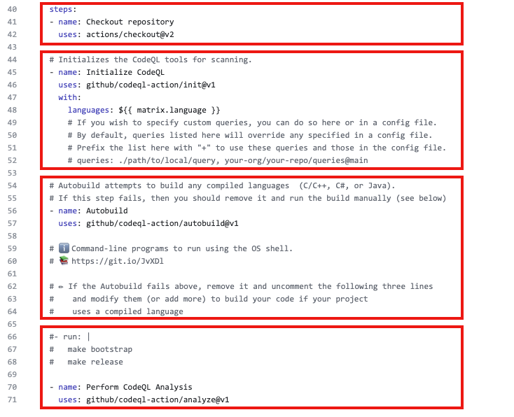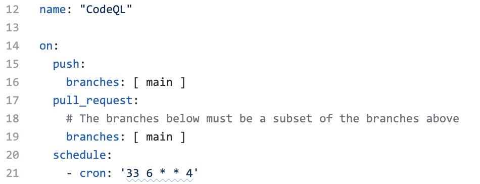CodeQL이 이미 설정된 GitHub 작업 워크 플로우 파일이 생성됩니다. Java는 편집 된 언어이므로 나중에 빌드를 설정해야합니다. GitHub 동작을 사용하는 대신 타사 CI 시스템으로 CodeQL 분석을 구성하려면 문서를 참조하십시오.