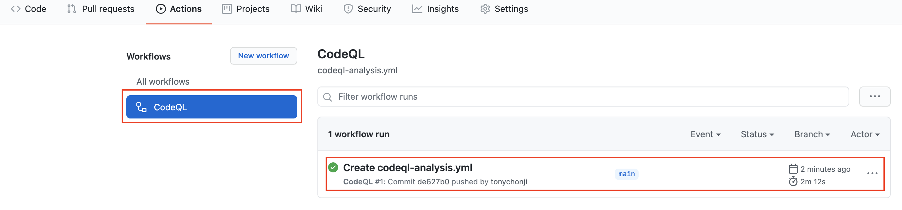 Actions 탭 -> CodeQL 클릭하십시오