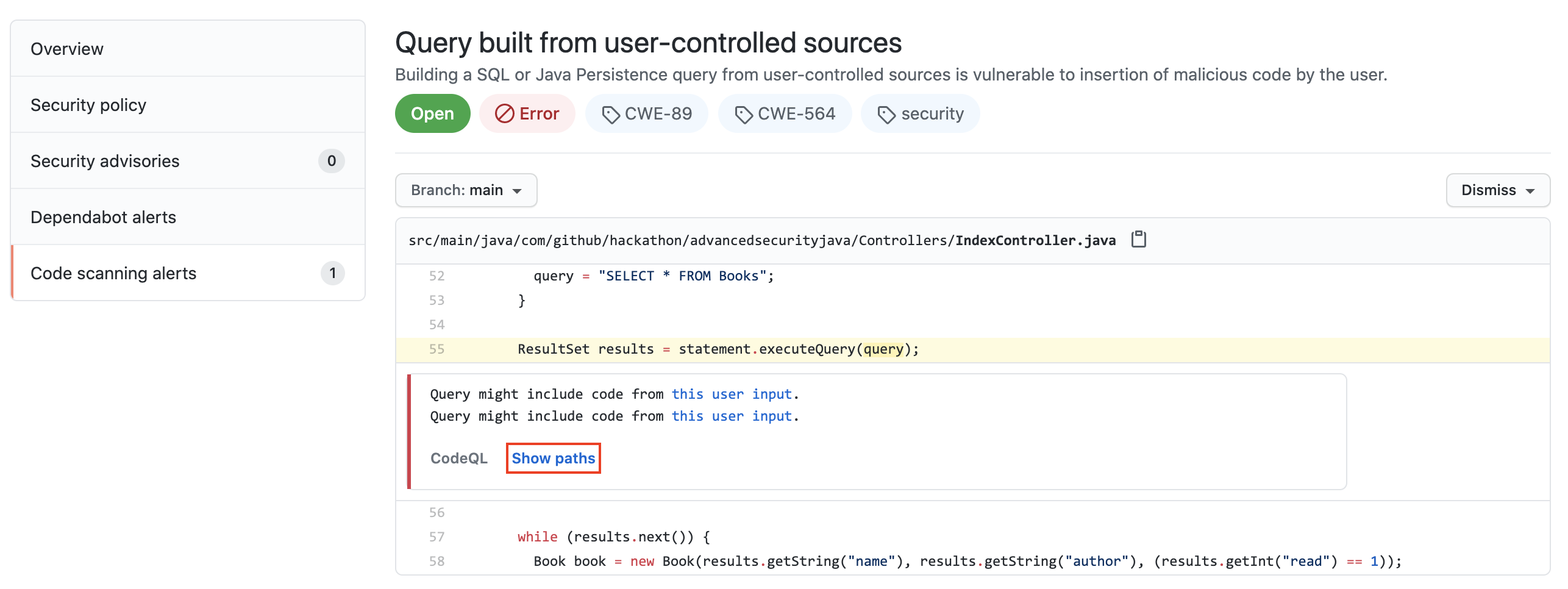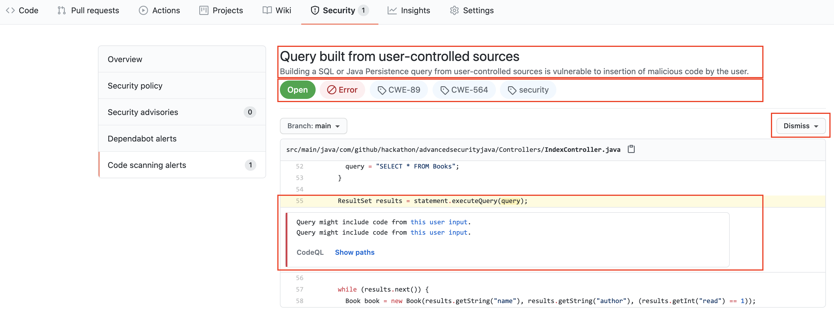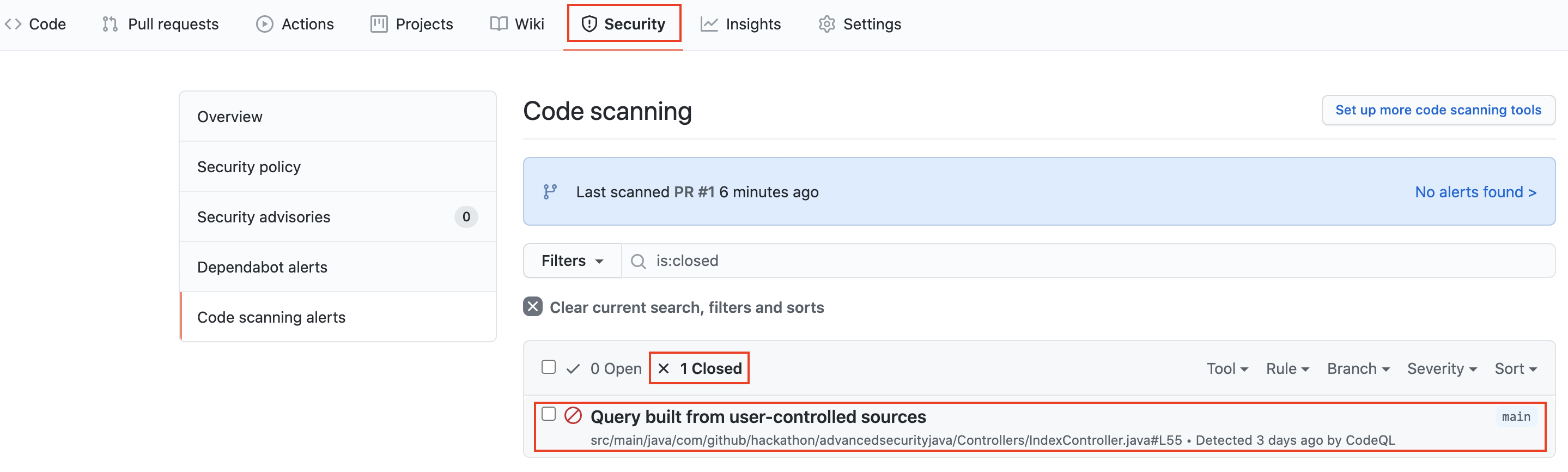 워크 플로가 완료되면 Security 탭 -> Code Scanning Alerts 클릭하십시오. 보안 경고 "사용자 제어 소스에서 구축 된 쿼리"가 표시되어야합니다.