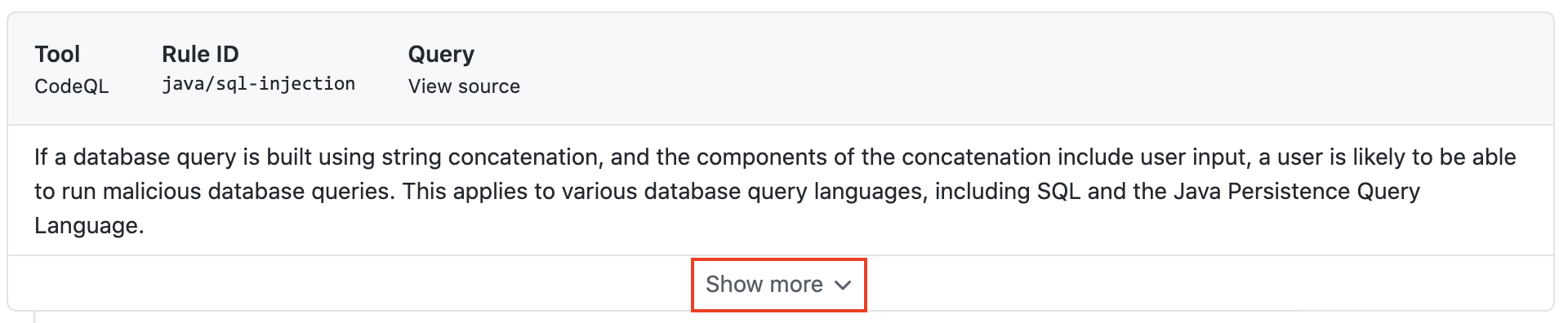 새 Code Scanning Alert 로 Show more details 클릭하여 Security 탭으로 이동하고 보안 경고 세부 사항을보십시오.